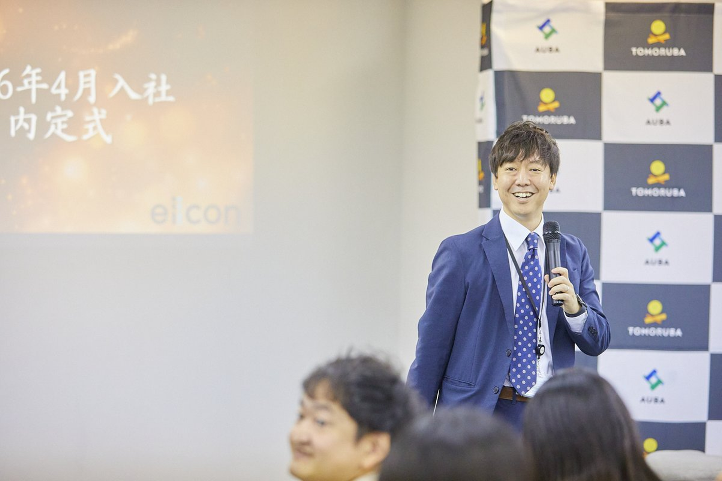 閉会の挨拶を担当した副社長の富田さんは、内定者を迎えられた喜びとともに、成長への環境を約束します。