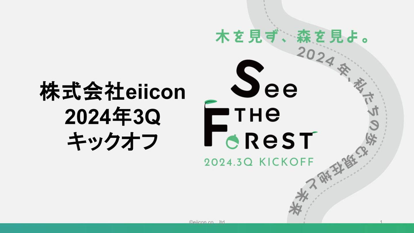 ■2024年3Qのテーマ テーマは『See the Forest』 日々、eiiconメンバーは目の前の仕事を全力でやることに集中しています。でもこの1日は「目の前」(木)ではなく、「未来」(森)を見て、みんなで思いを巡らせる1日としたいと考え、このテーマ設計にしました。