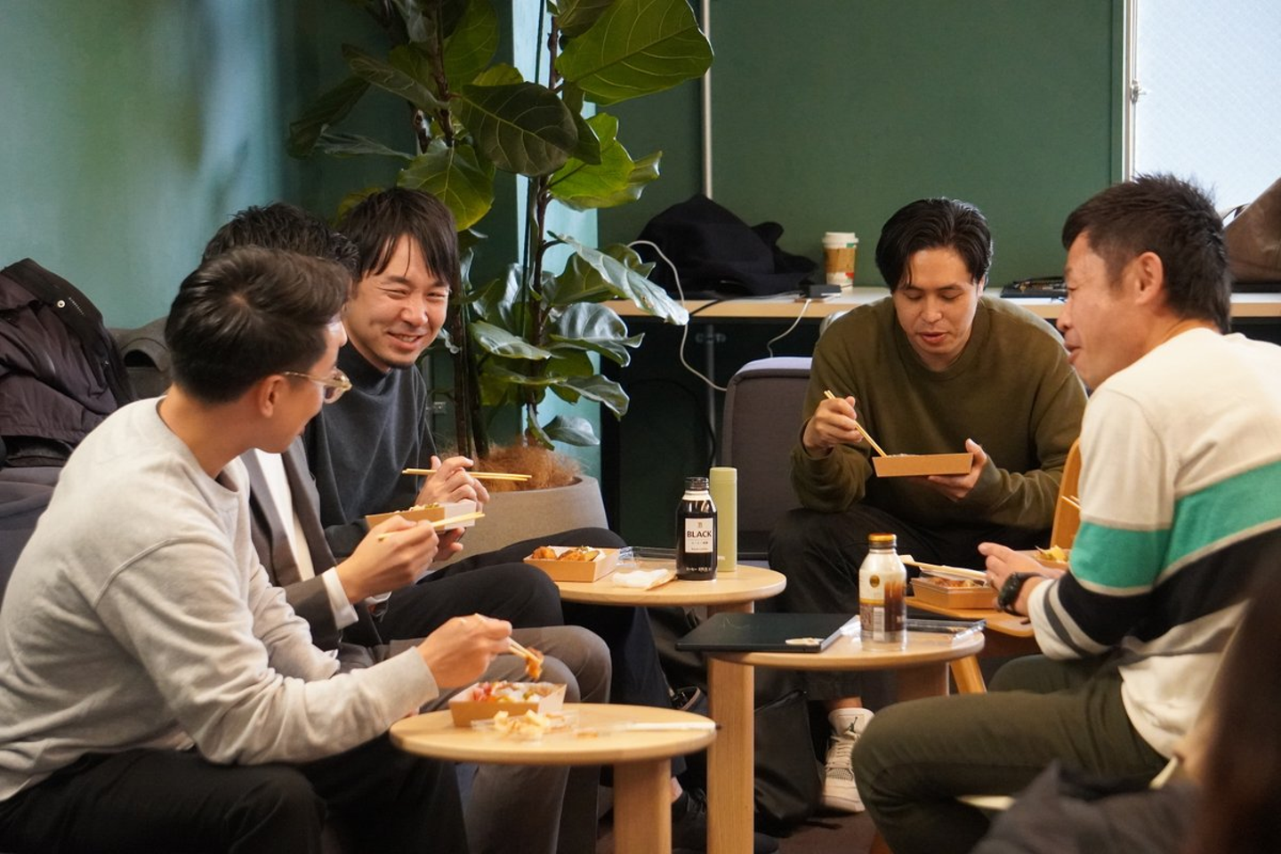 ・事業推進本部、メディア事業本部 副社長 富田直さん ・Platform事業本部 部長 新宮領宏太さん ・アライアンス推進室 室長 野田慎介さん ・イノベーションコンダクター事業本部、Consulting事業本部 執行役員 香川脩さん ・Consulting事業部 マネジャー 吉田翔さん ・インキュベーションクオリティ室 室長 下薗徹さん ・地域創生・イノベーション創出支援事業本部 部長 草柳友美さん ・地域戦略事業本部 執行役員/東海支社長 伊藤達彰さん ・人事本部 常務執行役員/CHRO 村田宗一郎さん ・boardより伝達事項 CFO 岡朋宏さん ■ランチタイム 前半戦が終了しランチの時間です。 ここでもコミュニケーション活性化のための施策がひとつ。 事前にアンケートを展開し、「語りたいテーマ」を募集して、10テーマに絞りチーム組成。 6~8名ずつのチームを組み、お弁当を食べながら共通の話題でトークをしました。