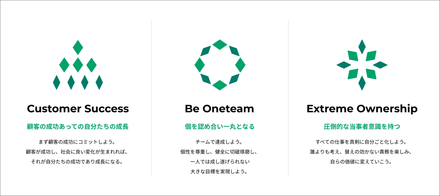 1つ目は、自分たちの成長よりもまず第一にお客様の継続的な成功と社会に良い変化を生み出すことにコミットしようという意味の「Customer Success」。