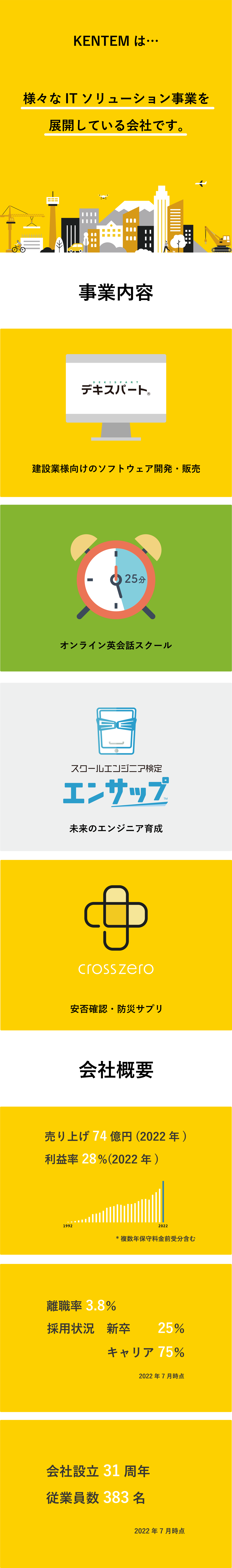 KENTEMは、「建設×ICT」のリーディングカンパニーです。 ICTを活用した建設業全体を支えるサービスを、すべて自社開発し提供しています。 製品は約46,000社で導入され、業界トップシェアです。特に、大手建設業(ゼネコン)では98%にご導入いただくなど、圧倒的な実績を持っています。 ▍サービスを一部ご紹介! 土木業界から圧倒的な支持を得ている『デキスパート』シリーズ  ̄ ̄ ̄ ̄ ̄ ̄ ̄ ̄ ̄ ̄ ̄ ̄ ̄ ̄ ̄ ̄ ̄ ̄ ̄ ̄ ̄ ̄ ̄ ̄ ̄ ̄ ̄ ̄ ̄ 施工管理業務をトータルにサポートする30種類以上のソフトがあり、大手ゼネコンで9割の導入率を誇っています。 ラインナップの充実と目的に合わせたカスタマイズが可能であること、そして現場の声を元にした開発力が人気の理由です。 建築業向け施工管理アプリ『PRODOUGU(プロドウグ)』  ̄ ̄ ̄ ̄ ̄ ̄ ̄ ̄ ̄ ̄ ̄ ̄ ̄ ̄ ̄ ̄ ̄ ̄ ̄ ̄ ̄ ̄ ̄ ̄ ̄ ̄ ̄ 土木業界での実績を元に、建築業界にも進出しています。 PRODOUGUは写真管理や鉄筋・配筋検査などの機能を持つ施工現場の効率化ツールです。 今後はデキスパートのように現場視点でより進化を遂げていく見込みです。 安否確認・防災・備災支援サービス『crosszero(クロスゼロ)』  ̄ ̄ ̄ ̄ ̄ ̄ ̄ ̄ ̄ ̄ ̄ ̄ ̄ ̄ ̄ ̄ ̄ ̄ ̄ ̄ ̄ ̄ ̄ ̄ ̄ ̄ ̄ ̄ ̄ KENTEMのビジョン「リスクゼロ社会へ」に向けた新ソリューションとして、 防災・備災に繋がる新たな仕組みを開発しました。 安否確認、防災情報、家族機能、リスク共有等の機能を通じて、 命を守るためすべての行動をサポートするサービスです。 ▼詳細はこちら https://x-zero.jp/ ▼これらは、全製品のほんの一部です。詳細については以下からもご覧いただけます! https://www.kentem.jp/ ▍今後に向けた新しい挑戦 建設業界を支える全ての事業を強化させることはもちろん、私たちが生活する社会にも目を向けて、新規事業や世の中に貢献する新しい取り組みにどんどん挑戦していきたいと思います。 また、静岡県内の中高生と地域社会をつなげるプロジェクトに参加したり、未来のエンジニアを育成するためのオンライン教材『エンサップ』を静岡大学と共同研究しリリースするなど、SDGs活動にも積極的に取り組んでいます。 ▼詳細はこちら シヅクリプロジェクト → https://www.kentem.jp/company/sdgs/ エンサップ → https://ensupp.jp/ 今後も、創業以来築いてきたノウハウを活かしながら、建設業界ひいては社会の常識を大きく変えるテクノロジーを生み出す新しい挑戦を続けていきます。