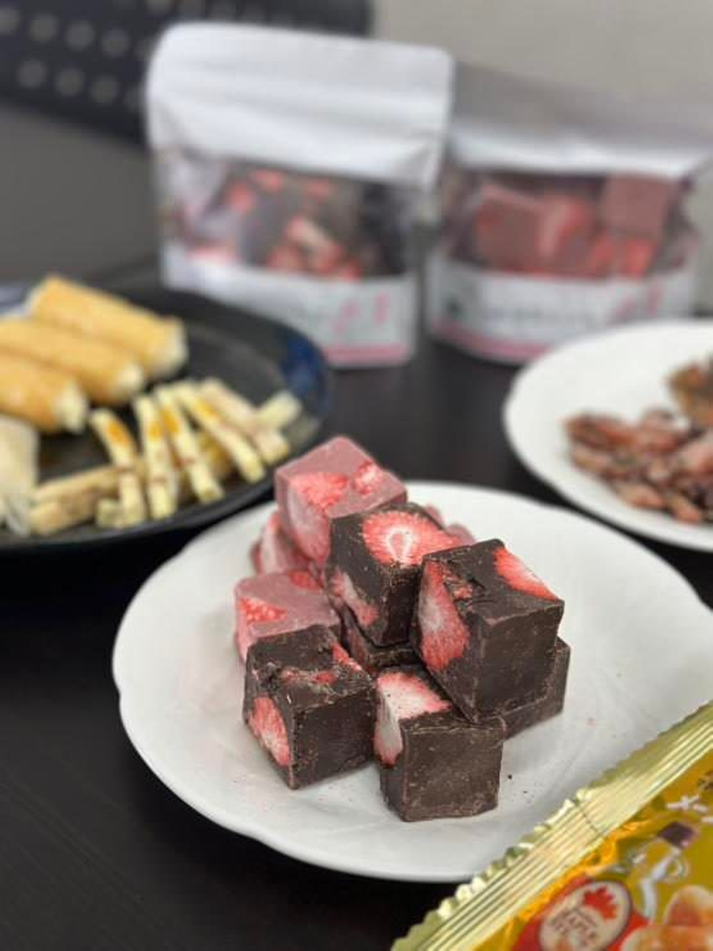フリーズドライした規格外のいちごと合わさってさらにトロピカルになったルビーチョコと苦味と酸味のマリアージュがたまらないビターチョコどちらも最高です!