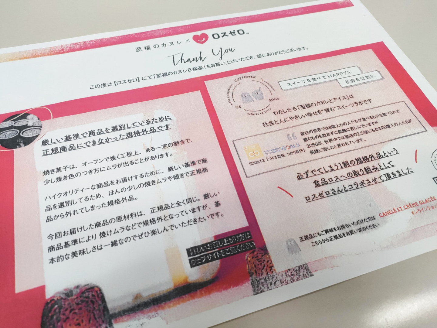 こちらは冷凍商品のため、メーカー様より直接発送いただいているのですが、「なぜカヌレが規格外品になってしまったのか」ロスの理由を説明するチラシも同梱いただいています!