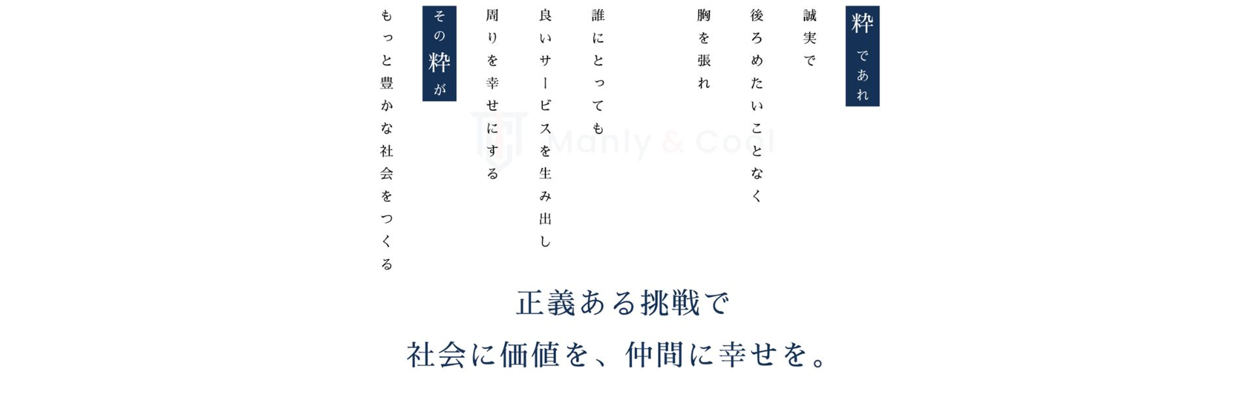 Manly&Coolは、真っ当な事業を通じて社会に良い影響を与え、その成果を社員や関わるすべての人々の幸せにつなげます。 【 Vision 】 「士魂商才を持って、仲間と社会を前進させ、日本を代表する成長エンジンとなる。」 古き良き日本の精神を現代に活かし、挑戦と誠実を原動力に、関わる全てを成長へと導く企業であり続けます。 【 Value 】 素直に真っ当に生きろ 挑戦と成長にこだわれ 結果に責任を持て 合理と感情を両立し正しい道を選べ 礼節と感謝を尽くせ 高い基準と品格を貫け 仲間と勝ちを分かち合え
