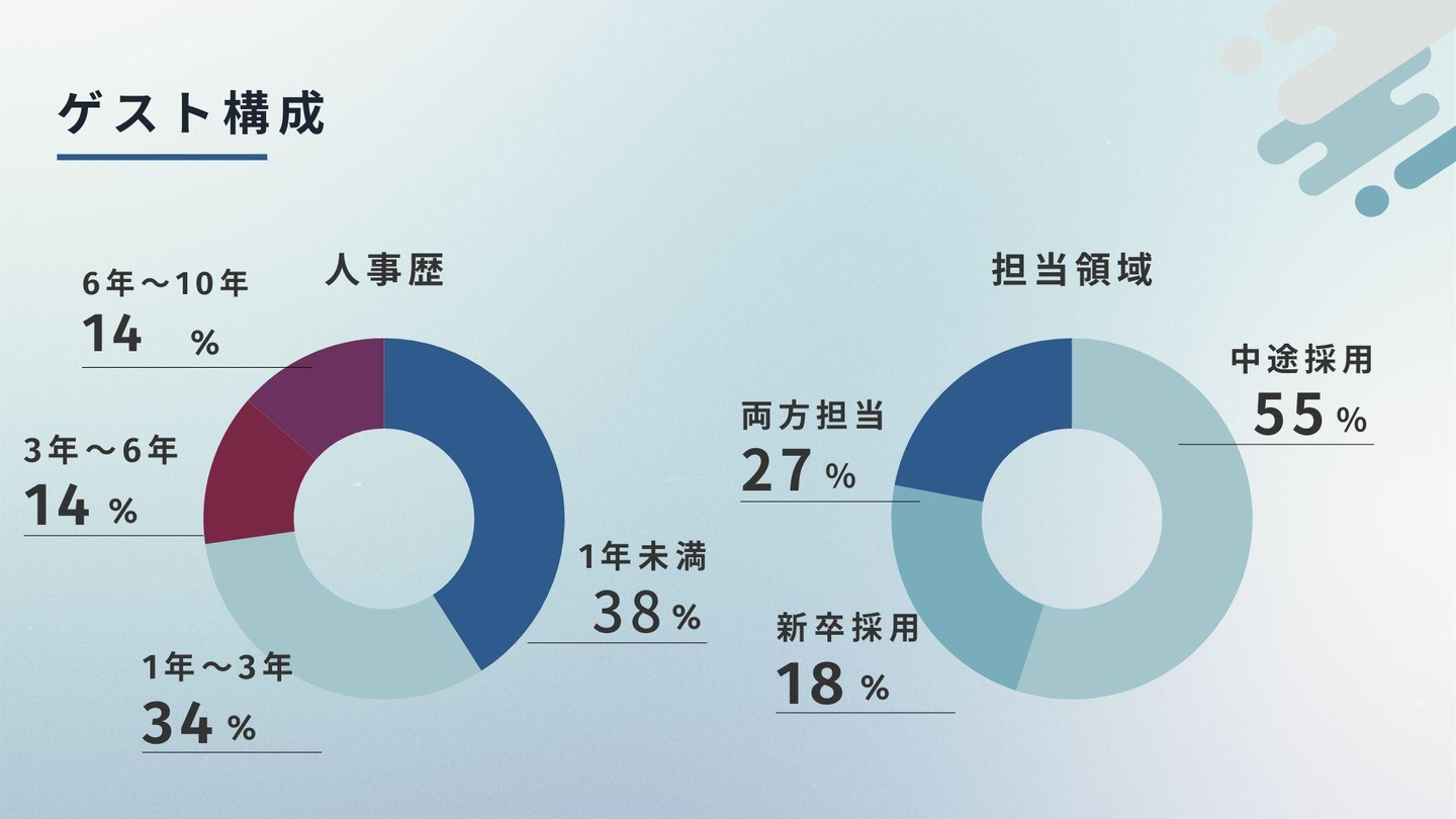 人事歴は6年以上のベテランから、1年未満の若手人事さんまで集まりました!そして中途・新卒どちらの担当の方も集まり、それぞれの課題や困っていることも共有できました。