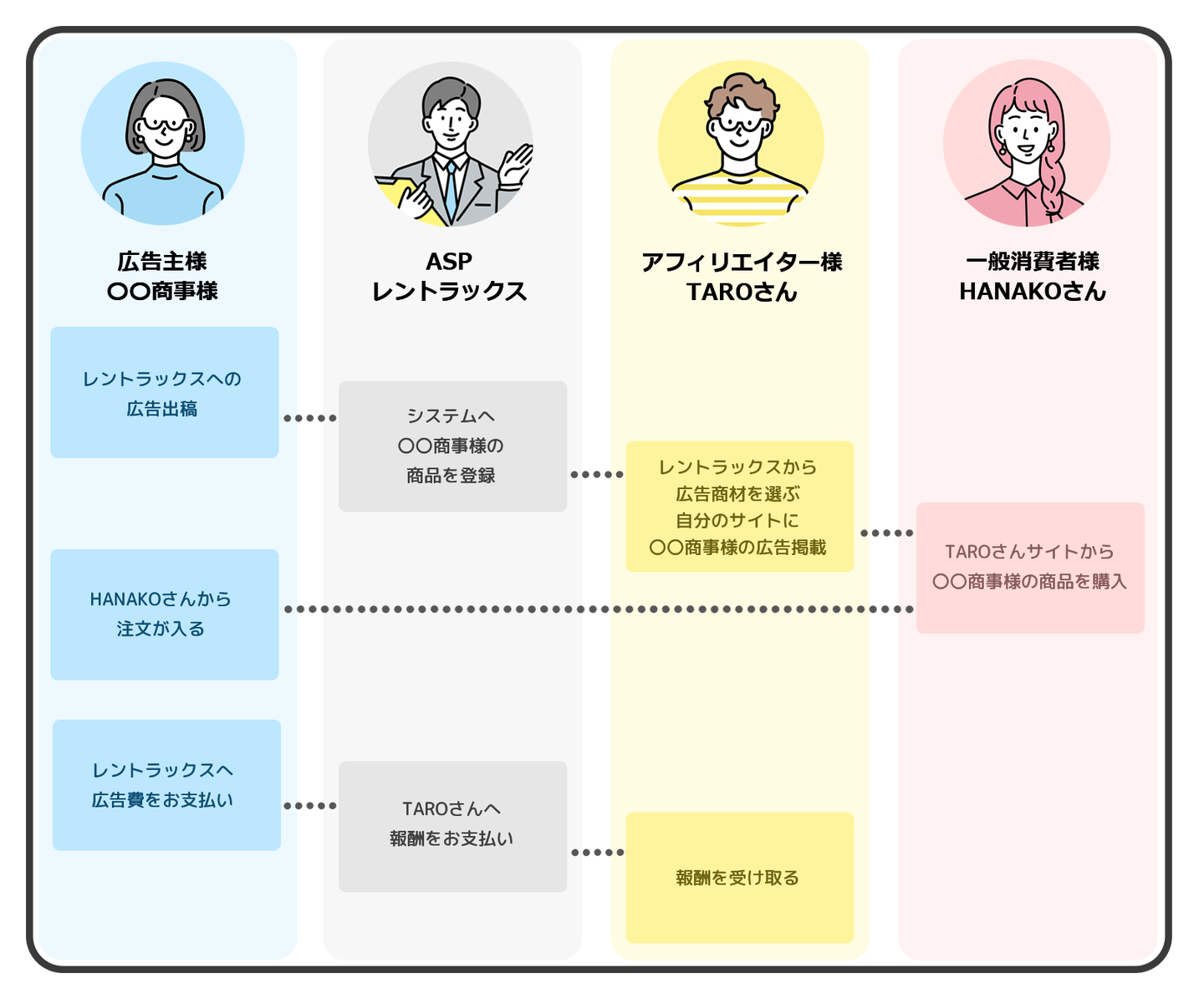 ASPは広告主様とWebメディア様をつなぐ広告プラットフォームとなっており、商品の販売数増加や新しいサービスの利用者獲得など、広告主様のPRニーズに合わせて、成果報酬型の広告掲載をご提案しています。