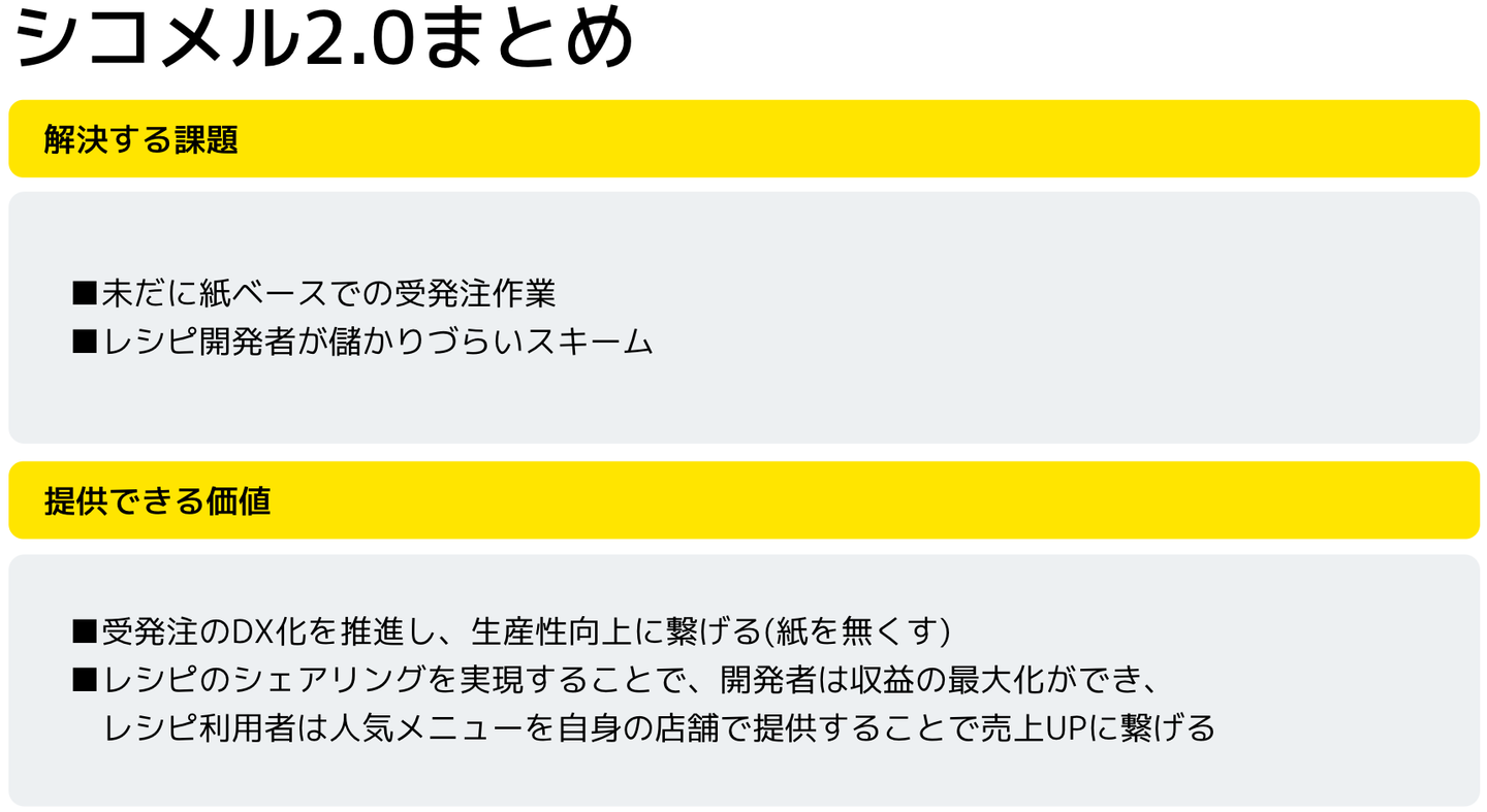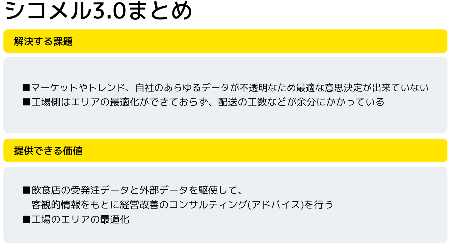 現段階のシコメル1.0では「仕込みの改善」ですが、その次に控えるシコメル2.0で「受発注の効率化」を、そして最後のシコメル3.0では「経営改善」を提供したいと考えております。