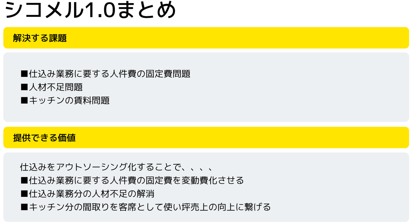 シコメル1.0のステップはすごくシンプルで、要するに仕込みのアウトソーシングです。店舗の厨房で行っていた調理を、我々で請けて工場が仕込みます。