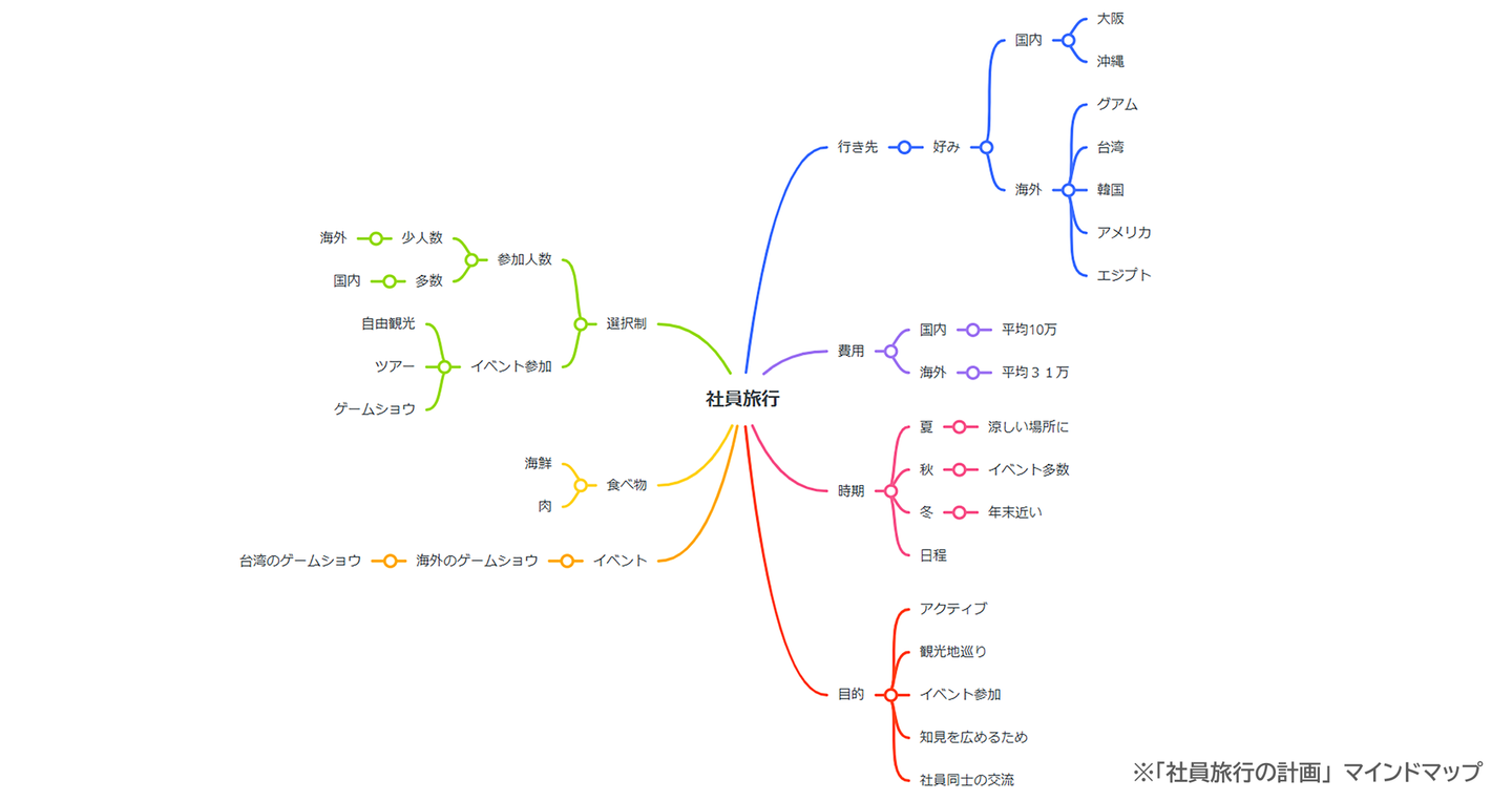 3日目はマインドマップを利用したブレインストーミングを行いました。ブレインストーミングは、チーム・個人でアイデアを出し合ったり、複雑な課題・問題を可視化するのに有効な手段です。これを使って、まずは個人で自己紹介をした後に「社員旅行の計画」のグループワークを行いました。