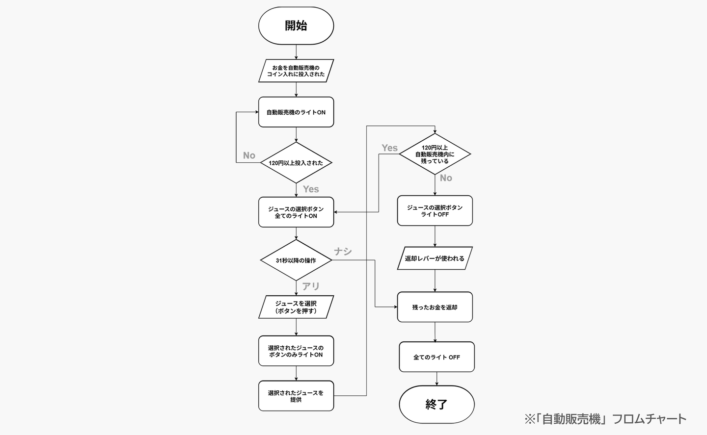 ポータブルスキル研修最終日は、アルゴリズムについて1日かけて勉強しました。アルゴリズムは問題解決の手順を言語化・図表化する考えです。そしてITの分野でアルゴリズムは、プログラム/システムの設計図と捉えられています。図で表現するフローチャートによって手順が可視化され、流れ確認がしやすくなります。例えば、下の画像のように自動販売機がお金を受け取ってジュースを出す仕組みを図で表現することもできます。テスト設計で手順が漏れなく全体を捉えながらテストされているかを説明するのに活用されています。