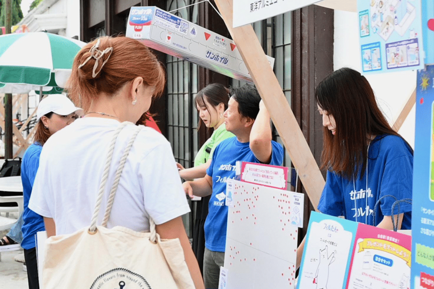 入口ではスタンプラリーが楽しめるうちわが手渡され、細長い通路の両脇には色とりどりのブースが。日頃コミュニティで交流している担当者の方と語り合う姿、共創で生まれた商品を興味深く眺める姿、試供品を試す姿、フェイスペイントやキックターゲットに興じるお子様。あちこちでさまざまな声が生まれ、混ざり合っていきました。