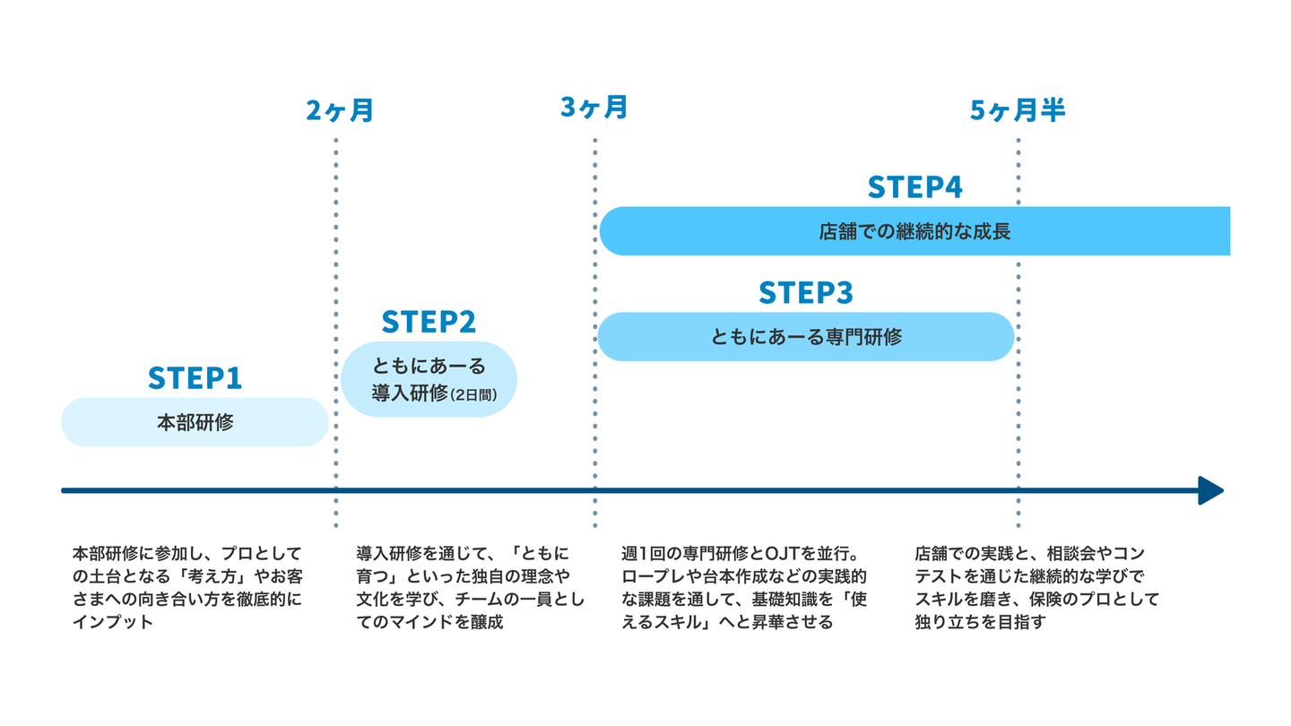 お客さま一人ひとりの人生に深く寄り添い、最適な未来をともに描く「保険のプロ」を育成すること。そのために、知識だけでなく、プロとしての”考え方”の土台から徹底的に作り上げる、段階的なカリキュラムを用意しています。