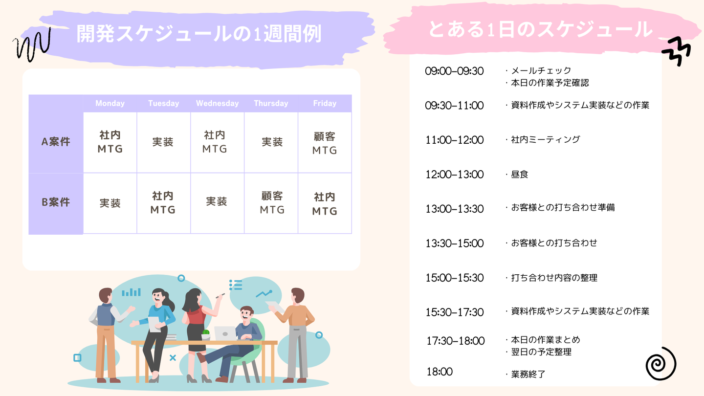 案件ごとに3~4名(統括責任者/ PM/PL/メンバー)が担当し、1日おきに社内ミーティングを行います。週1回はお客様とお打ち合わせもしています。社内MTGと実装を繰り返して、お客さまとのお打ち合わせに臨んでいます。