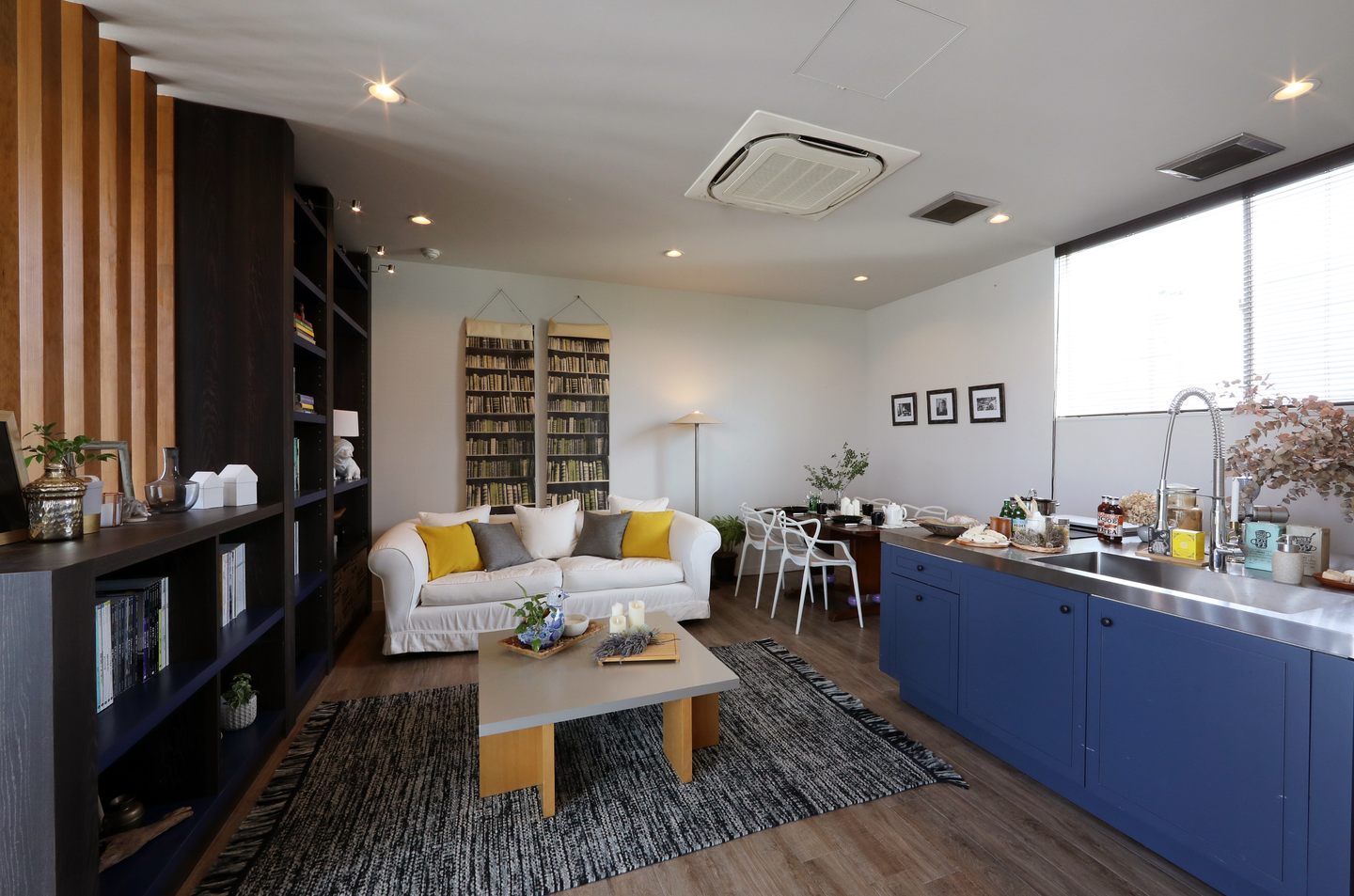▲カフェの上は la CASA 安城店。ライブラリースペースでは雑誌やラ・カーサの施工例をご覧いただけます。右手はラ・カーサオリジナルの可動式キッチン。いつもは部屋の隅にあるのですが、料理や紅茶のワークショップをする時には手前に移動して、参加者の皆さんでキッチンを囲みながら、行います。