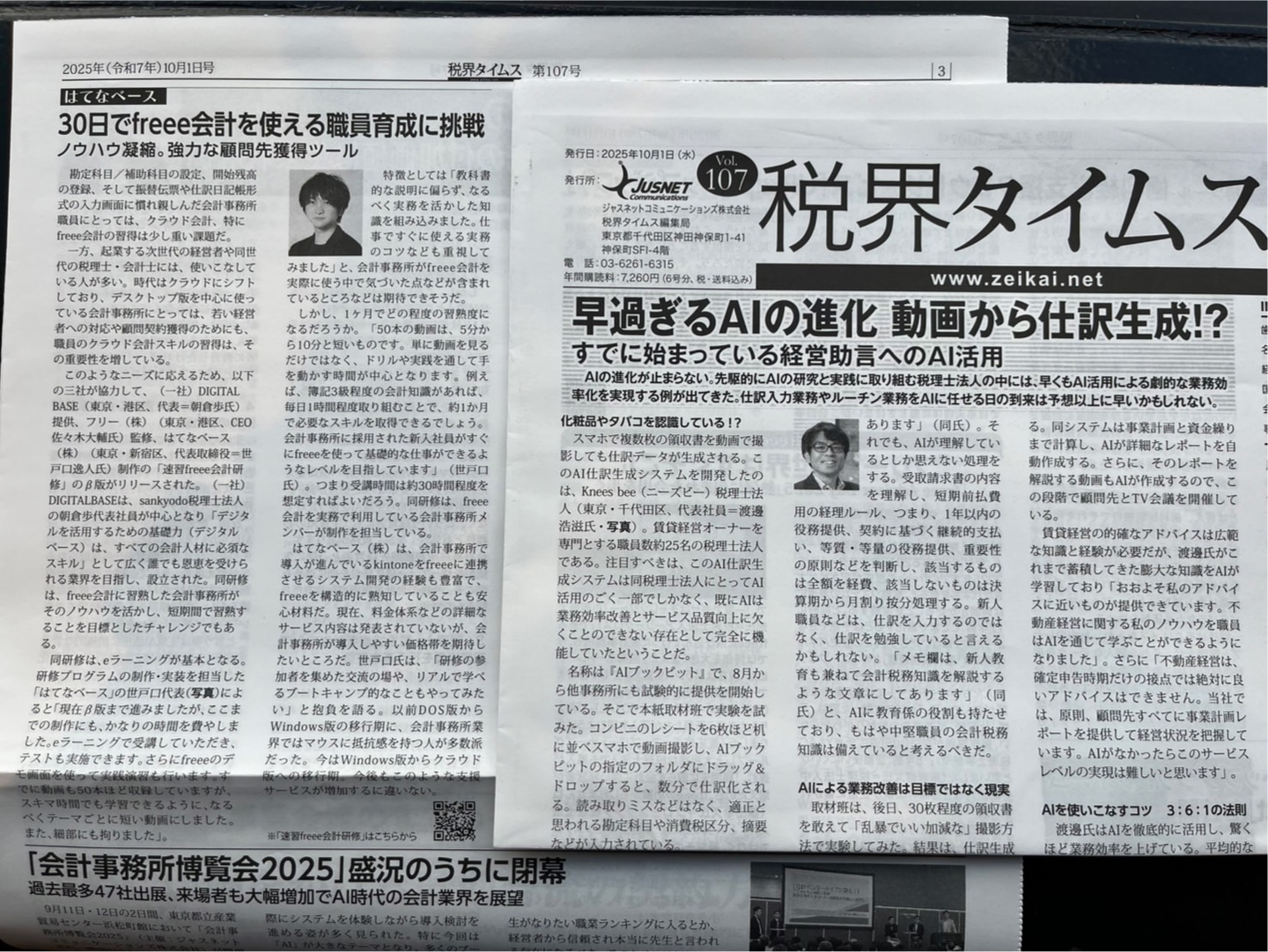 「税界タイムス」は、税理士業界の動向をはじめ、顧客獲得のための手法、事務所経営に関するノウハウ、業務に関連するITニュースなど、厳選した情報を掲載した税理士・公認会計士のための新聞です。 毎号、読みやすい内容の紙面をお届けします。 税理士・公認会計士が購読する新聞としては、国内最大級の新聞です。 107号 2025年10月1日号 1面 動画から仕訳生成!? AIが会計の常識を覆す ...