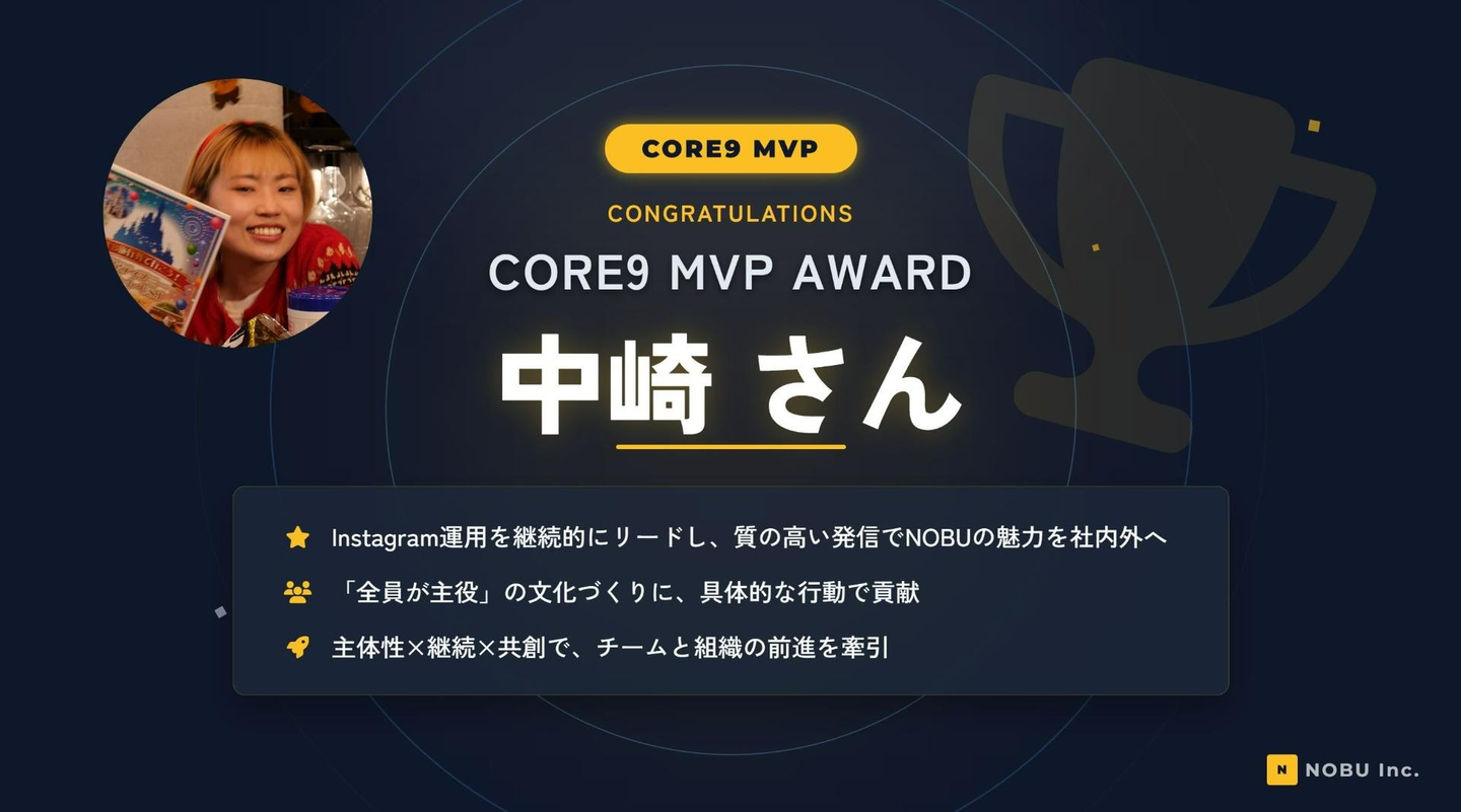 そのCORE9の考え方を一年間最も実践し、「全員が主役」の文化づくりに貢献したメンバーを称えるのが、「CORE9 MVP」制度です。