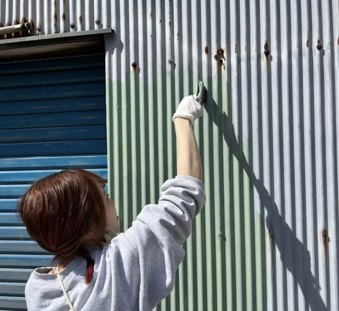※空き家にペンキ塗りをしている私の様子です。サークルメンバーと協力し、壁一面にペンキを塗りました。ペンキを塗り終えたときの達成感はもちろん、空き家の所有者様も喜んでくださり、とても嬉しかったです。