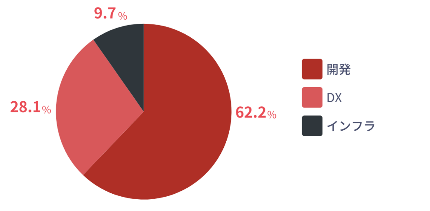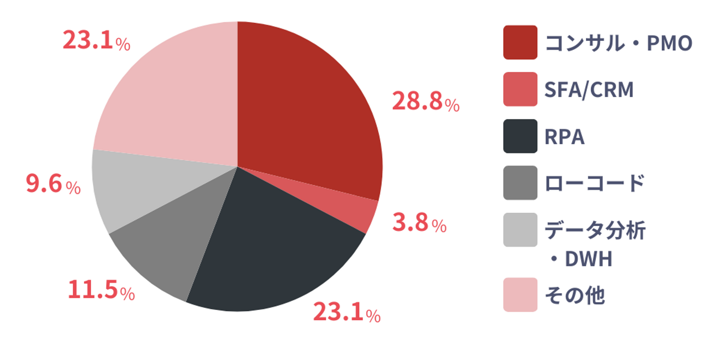 【得意分野(DX)】 DX領域では、コンサルタントやPMOが全体の28.8%を占めており、顧客の業務改善やプロジェクト推進を力強くサポートしています。上流工程からプロジェクトに関与することで、より本質的な課題解決に取り組んでいます。 また、RPA(Robotic Process Automation)をメイン技術とするプロジェクトへの参画も増加しており、業務自動化や効率化のニーズにも柔軟に対応しています。