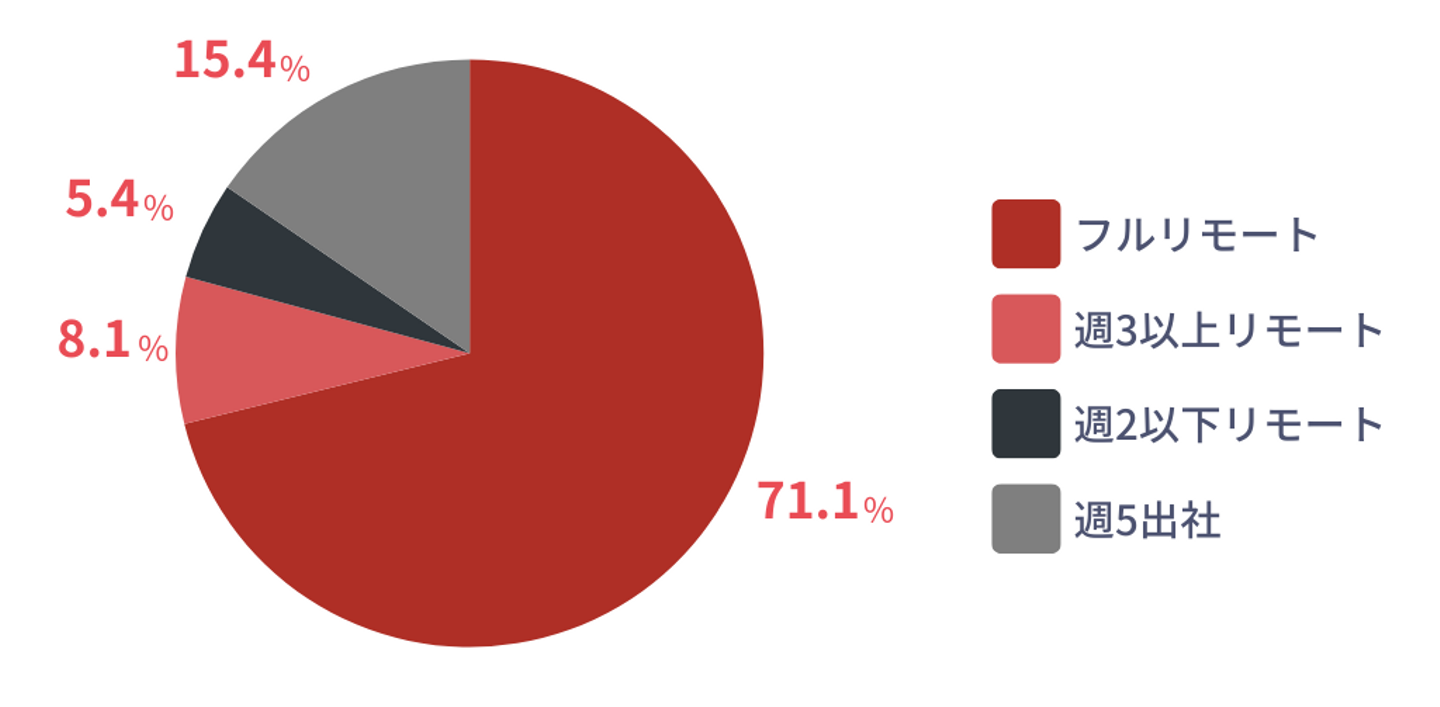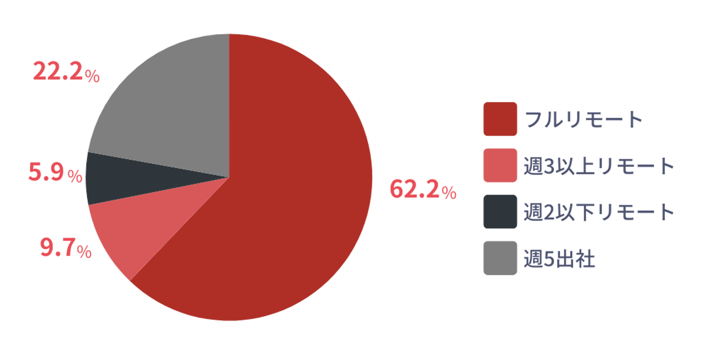 5|リモートワーク率 【全体】 【経験3年以上】 【経験3年未満】 全社員のリモートワーク率を見てみると、フルリモート勤務が62.2%、週3日以上リモート勤務が9.7%、週2日以下のリモート勤務は5.9%、週5日出社(完全出社)の割合は22.2%となっています。 この高いリモートワーク率は、エンジニアや営業をはじめとする社員一人ひとりの日々の努力と主体的な業務遂行によって支えられています。