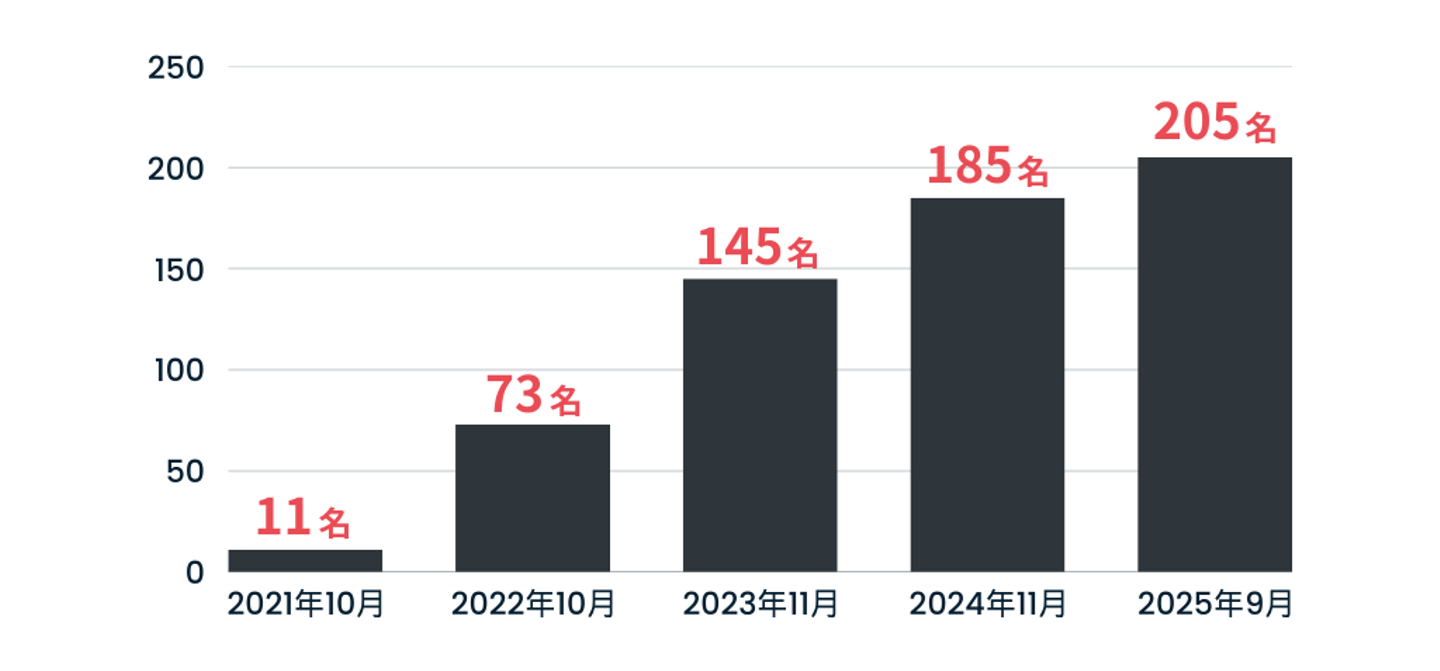 1|社員数 採用基準の見直しをおこない、社員増加率は緩やかになっていますが、2025年に社員数が200名突破。 9月現在は、エンジニア185名と管理部20名(インターン生2名を含む)205名体制となっています。