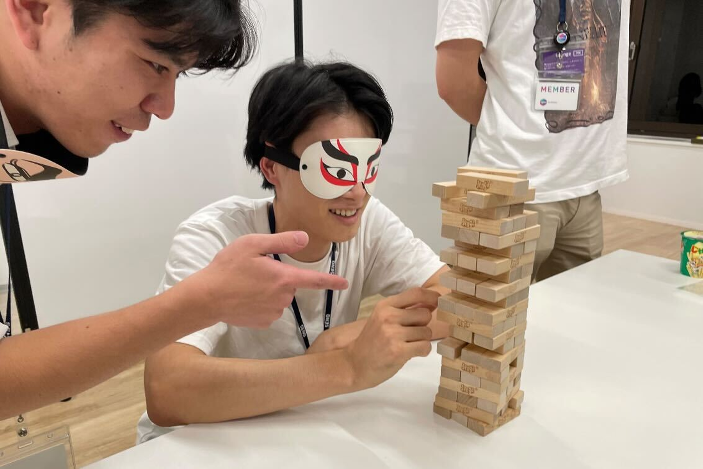 片方が指示役となり、もう片方は目隠しをしてペアの指示をもとにジェンガを積みます。