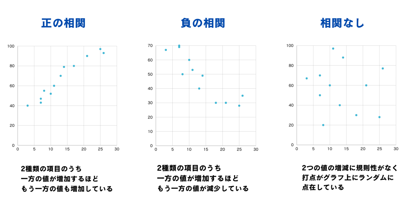 散布図には、「正の相関」「負の相関」「相関なし」の3つのパターンがある。