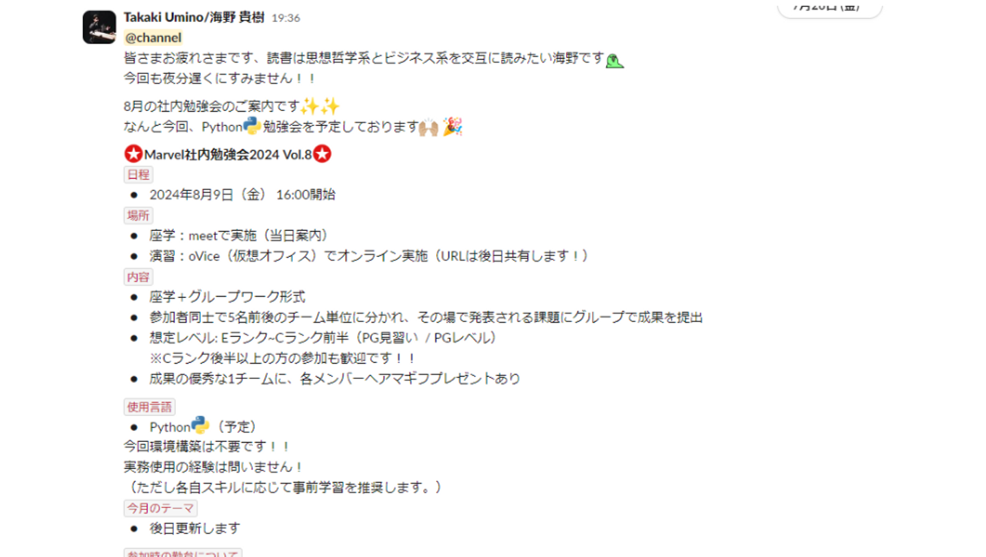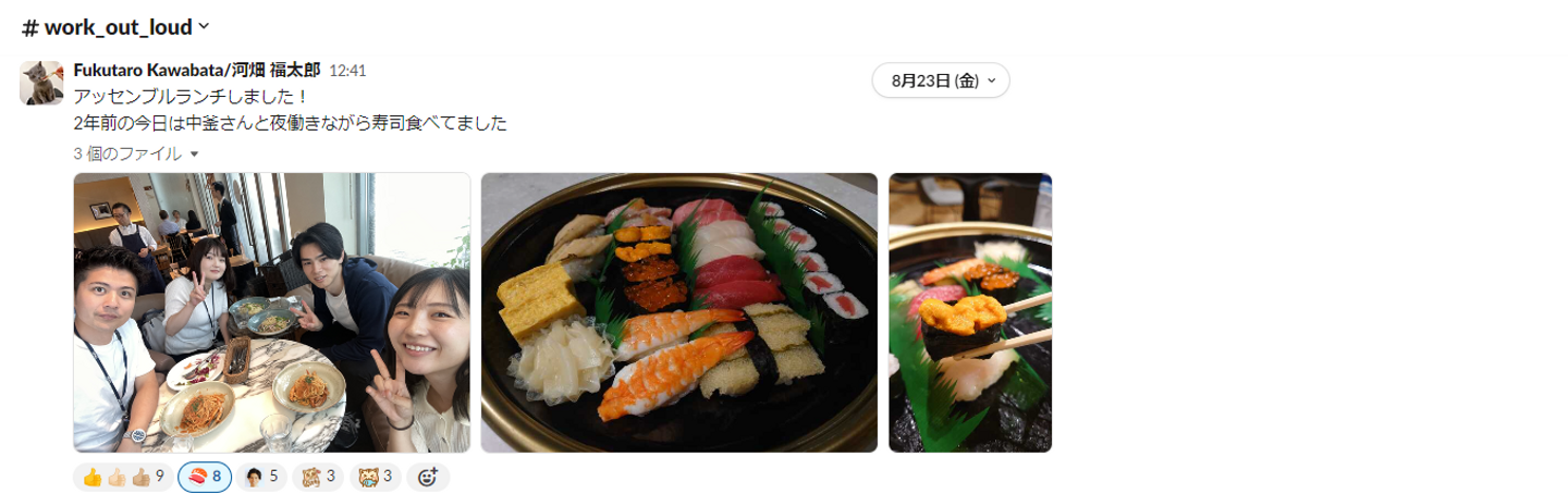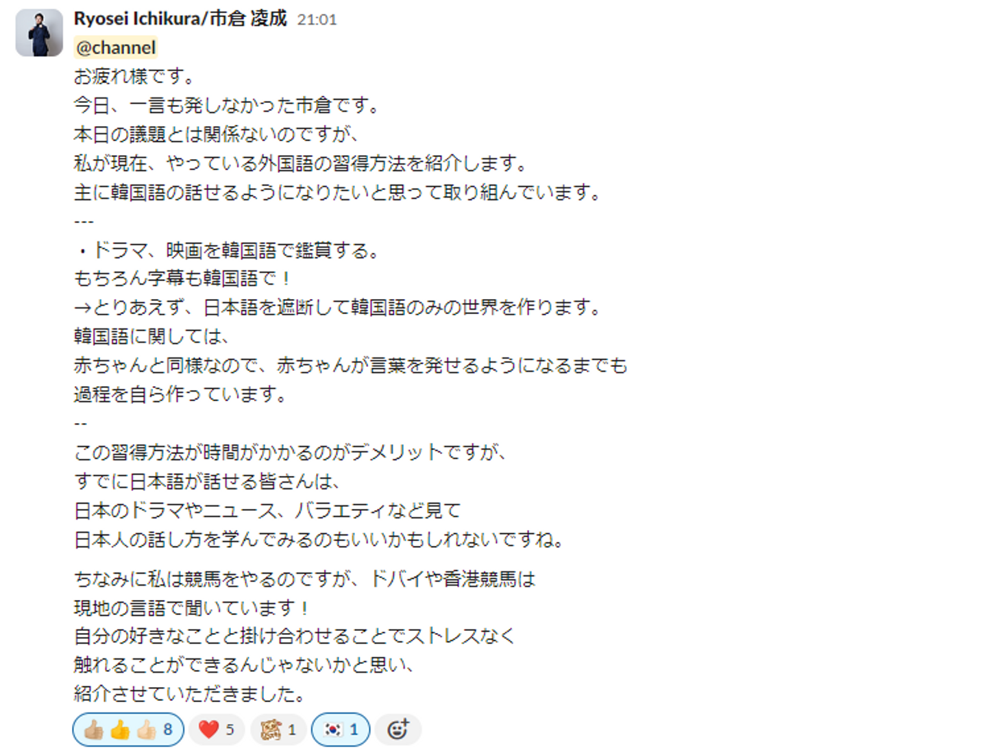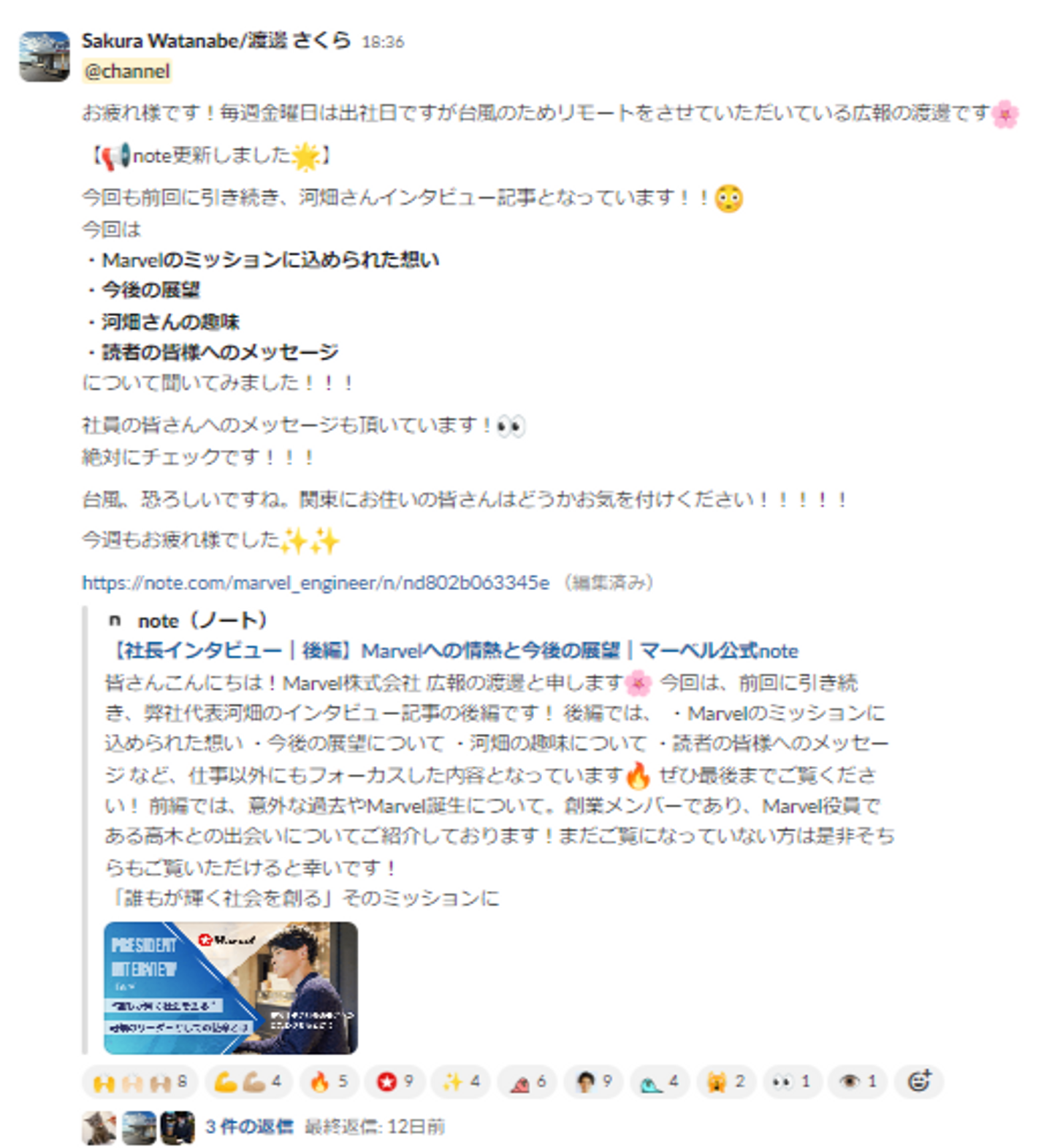 このように、とにかく自由につぶやくチャンネルです!私の入社と共に始動し、最初は私が一人で毎日つぶやいていたのですが、コツコツ続けていくうちに徐々に発信をしてくださる社員が増えてきました✨
