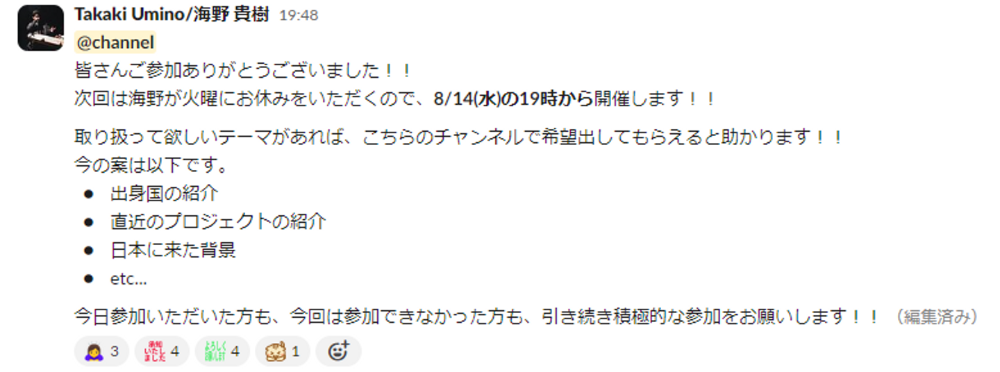 今後の展望として、社内サークルを更に盛り上げたり、雑談チャンネルなどでより多くの社員が発信する立場として参加していただけるような施策を引き続き考えて参ります!