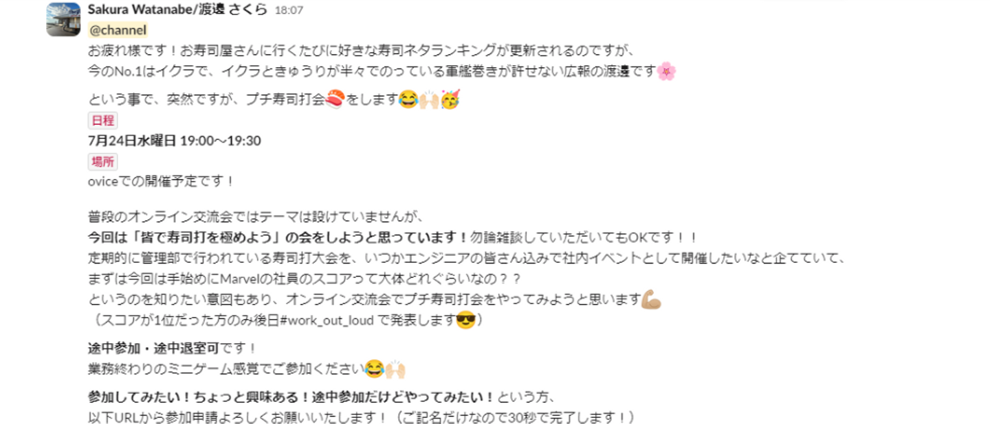 皆さん、こんにちは!Marvel株式会社 広報の渡邊です🌸弊社では、社内交流の場として、オフラインでの交流だけでなく、気軽に参加可能なオンラインでの交流も実施しています💻現在実施している社内交流...