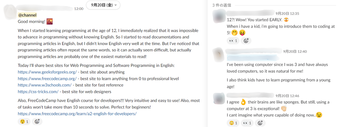 今年の9月(先月)に始動したばかりのサークルですが、専用チャンネルでは既に英語onlyでのコミュニケーションが行われています。