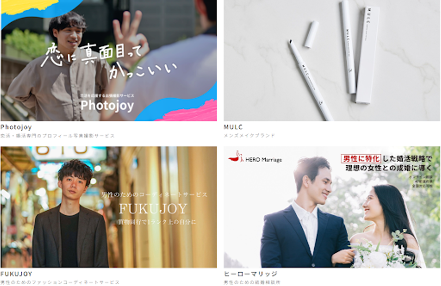 株式会社アルファブルは「あなたをもっと魅力的に。」をビジョンに掲げ、なりたい⾃分になるためのお手伝いをする企業として様々なサービスやプロダクトをご提供いたします。恋活・婚活に特化した出張撮影サービス「Photojoy」、ファッションコーディ ネートサービス「FUKUJOY」、男性のための結婚相談所「ヒーローマリッジ」の運営、メンズコスメブランド「MULC」の企画・販売を行っております。