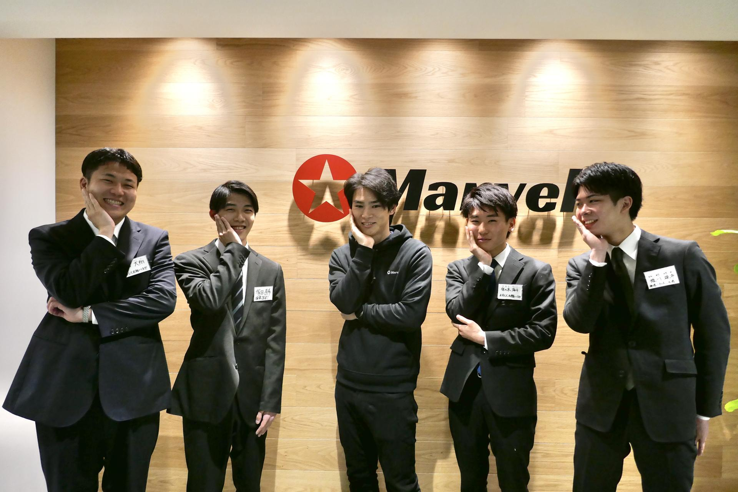 「お好きなポーズで!」と無茶振りをしたらなぜか小顔ポーズをしだす代表河畑&新卒メンバーたち✪