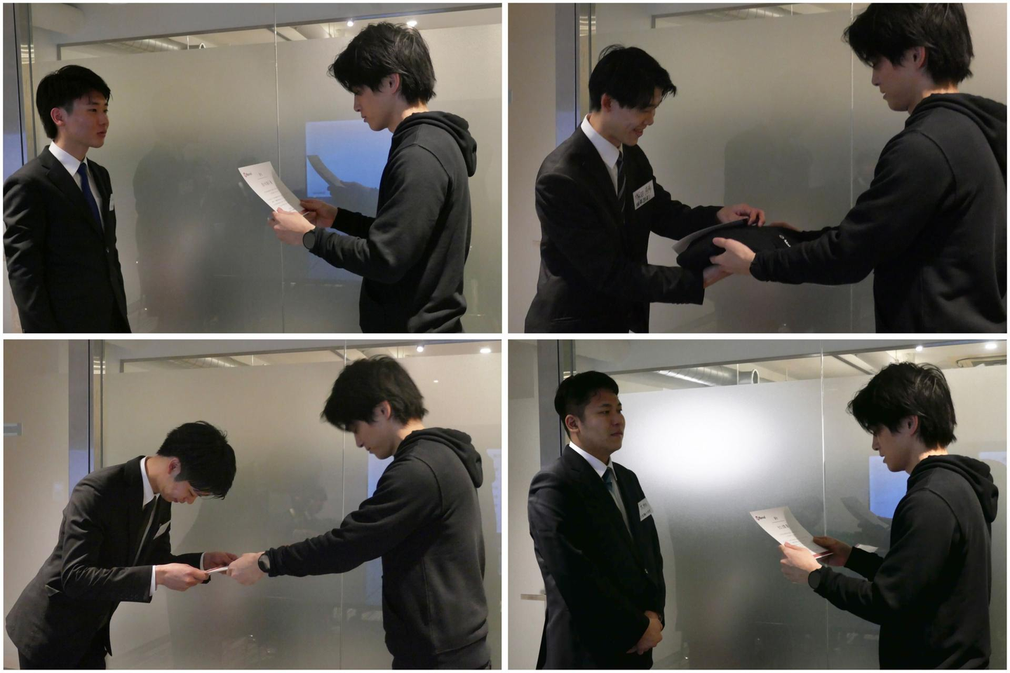 式典では辞令交付と記念品贈呈が行われ、新入社員一人ひとりに辞令書と、Marvelのロゴが入ったパーカーが手渡されました。