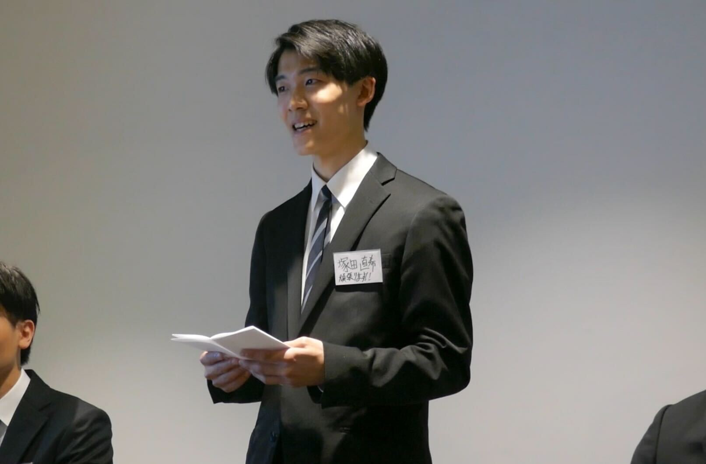 「皆さまおはようございます。本日入社いたしました、塚田直希です。 このたびMarvelの一員として、新たなスタートを迎えられることを大変光栄に思っております。社会人としての第一歩を、このような素晴らしい環境で踏み出せることに、大きな喜びとともに、身の引き締まる思いになります。