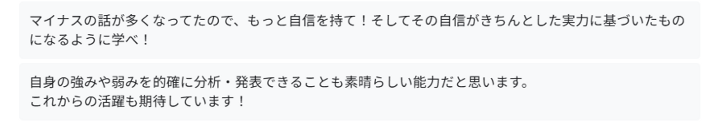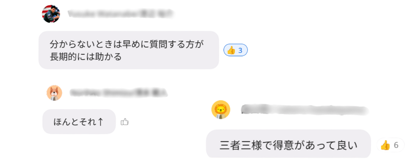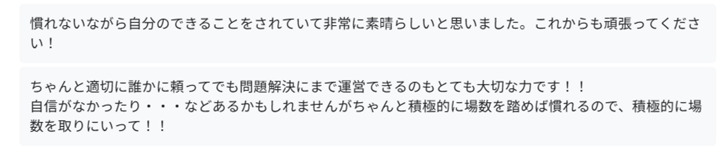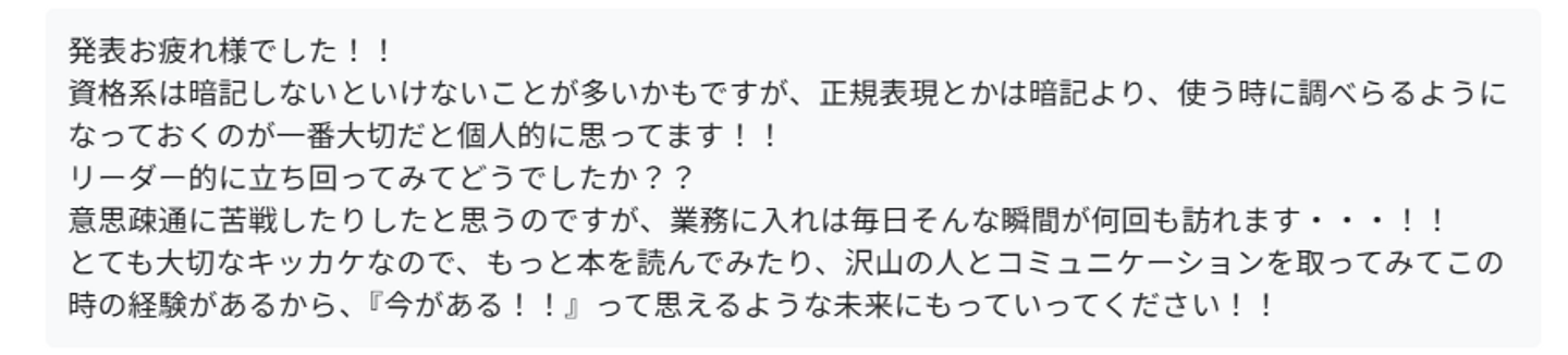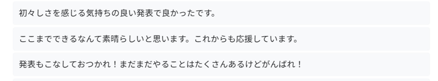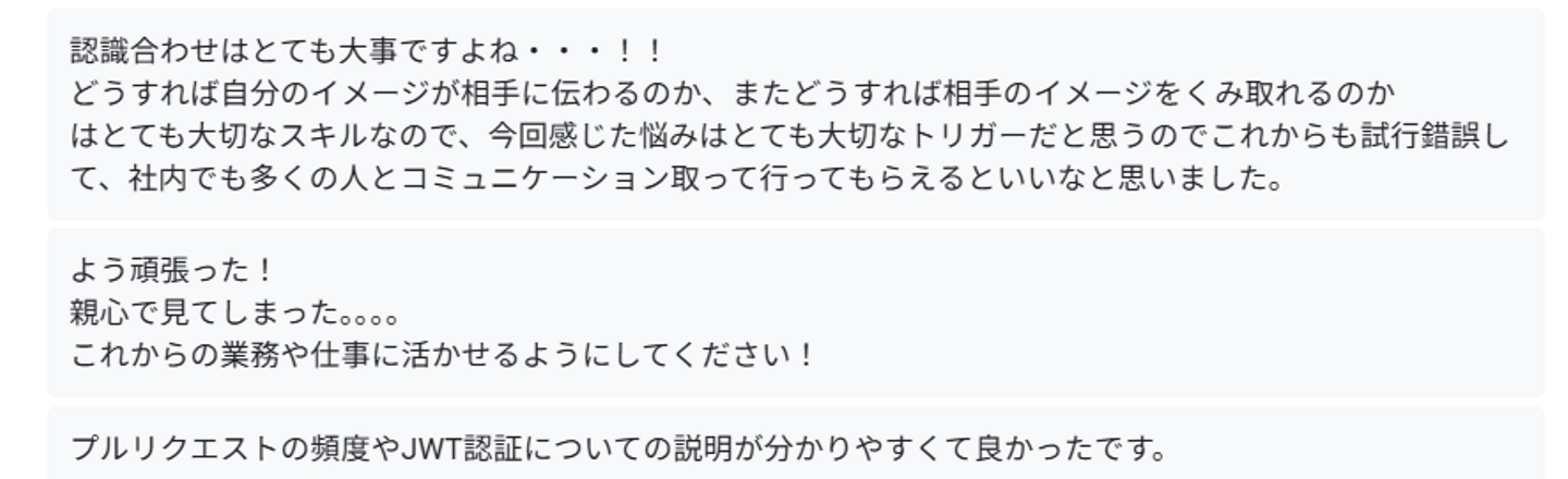 また、発表会後、改めて先輩エンジニアの皆さんに3名へのFBアンケートにご協力いただきました。温かいコメントや、3名への成長に期待を寄せたアドバイスが集まりました!