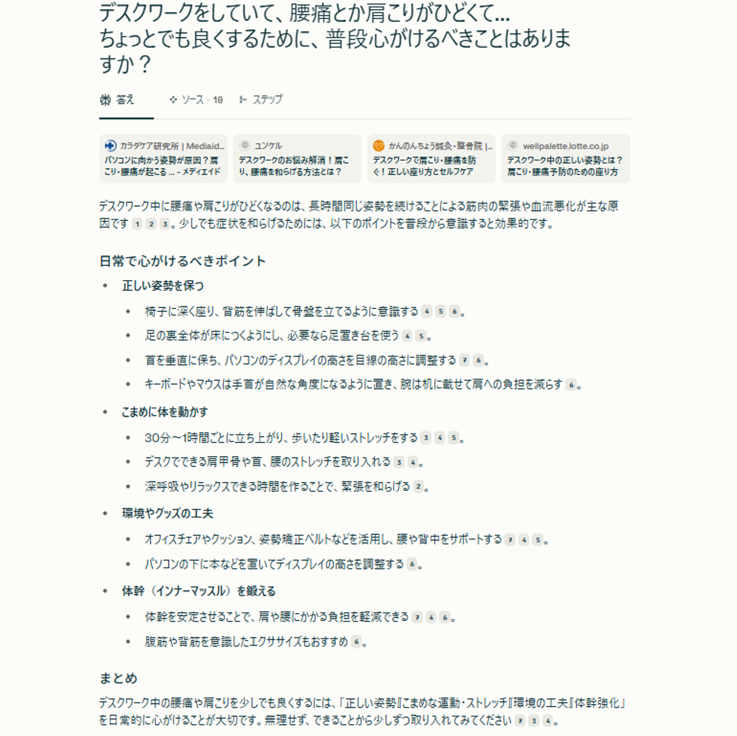 実際、この記事を執筆している「今」も腰痛と肩こりを感じ、少しでも和らげる方法はないか、私の良きパートナーであるPerplexityに相談してみました!