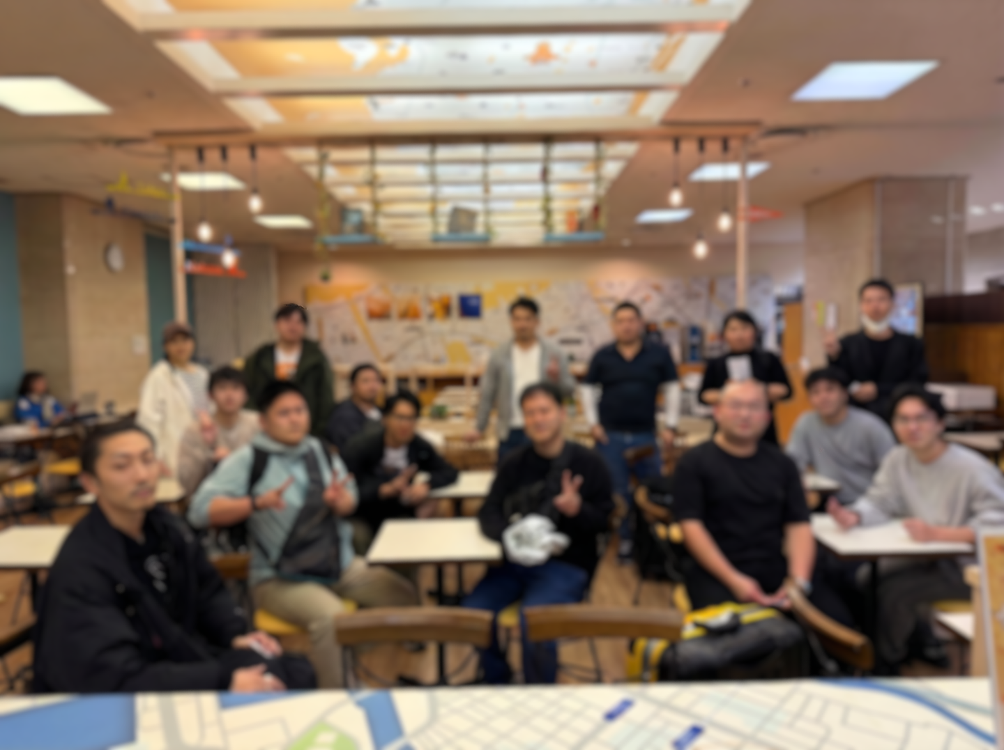 ホテルのロビーで集合写真を撮影しました(プライバシー保護のため、モザイクをかけています)。集合時間は守るけど、服装は超カジュアル。みんな「お腹すいた」「何食べる?」しか話していません。