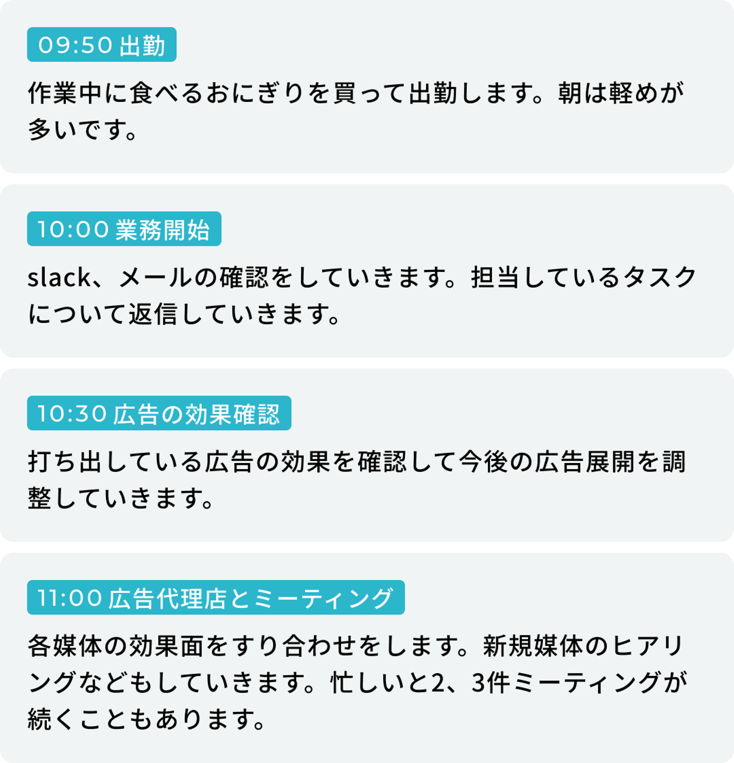アプリ・WEBサイトの更新作業、キャンペーンの企画・効果測定、新しいコンテンツの開発サポートをしていきます。サービスの特徴、顧客ニーズ、競合情報を分析し、各種マーケティング施策の企画・実施を行い、サービスの促進、ブランドイメージの向上を図ります。