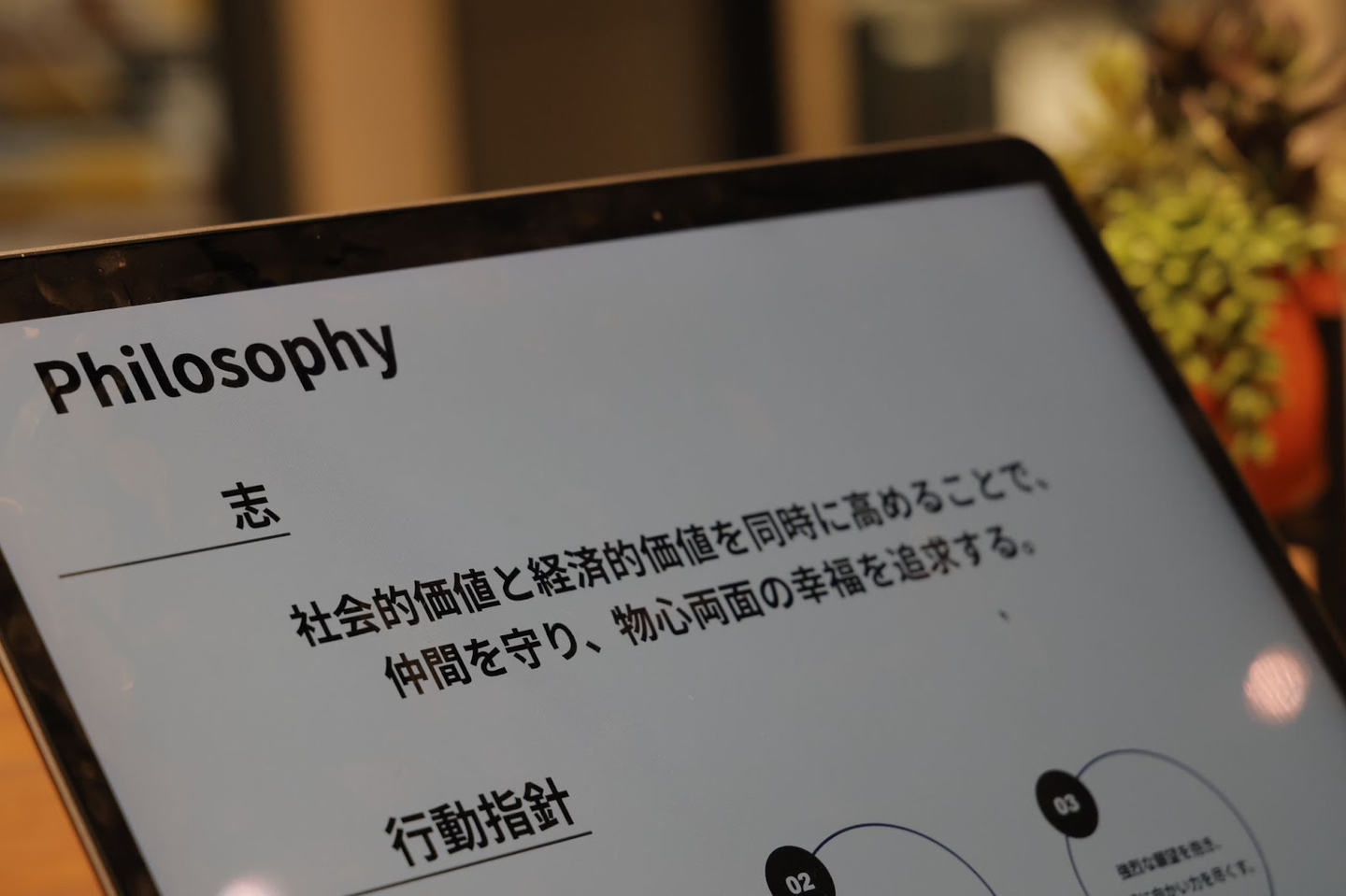 志は「社会価値と経済価値を同時に高めることで仲間を守り物心両面の幸福を追求する」とちょっと硬い印象があるかもしれませんが、結局のところ「自分も周りもハッピーになろうぜ。I am happy だけじゃなくてWe are happy」を目指していこうよ、みたいなことなんですね。