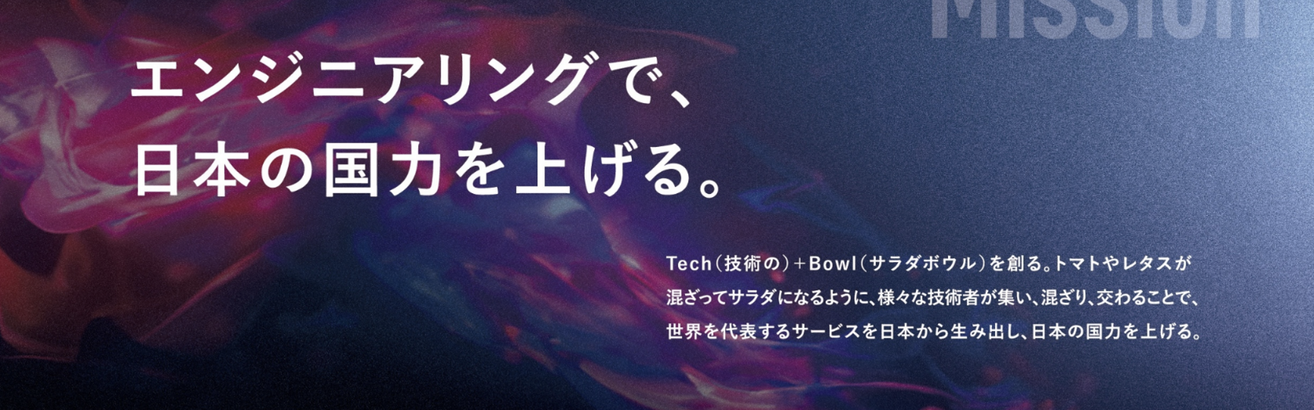 「Tech(技術の)」「Bowl(サラダボウル)」を創ります。トマトやレタスが混ざってサラダになるように、様々な技術者が集い、混ざり、交わることで、GoogleやAmazonのような世界中で使われるサービスを日本から生み出し、日本の国力を上げます。2019年に開始したキャリアを伸ばすエンジニア塾「TechTrain」は口コミで広がり、現在8,500名以上のエンジニアにご利用いただいています。次世代のエンジニアの卵をプロ130人以上が会社の垣根を超えてみんなで育て、輩出する仕組みを創ります。