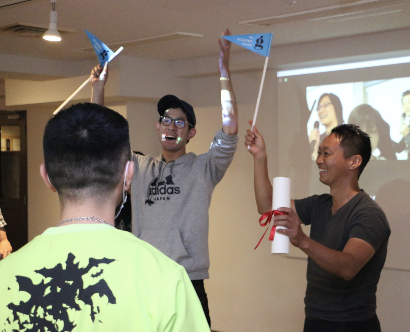 プログラミングスクール在学中(写真はそのクラスメート)に富治林さんと塚田さんが立ち上げたRsmile株式会社。同じクラスに在籍する様々な分野のプロを巻き込みプロダクトやローンチ用のLPを作りこんでいきました。まだ基本のプログラミング言語を学ぶ初期授業の段階からすでに外部のプロも巻き込み、そのままの勢いで卒業制作プロダクト発表会まで走り抜き、結果はみごと優勝!!
