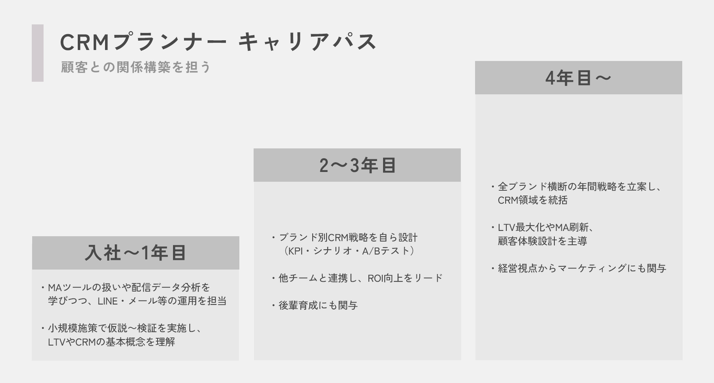 データ分析に基づくLTV最大化設計や、MAツールの刷新、カスタマーエクスペリエンス全体の最適化にも取り組みます。