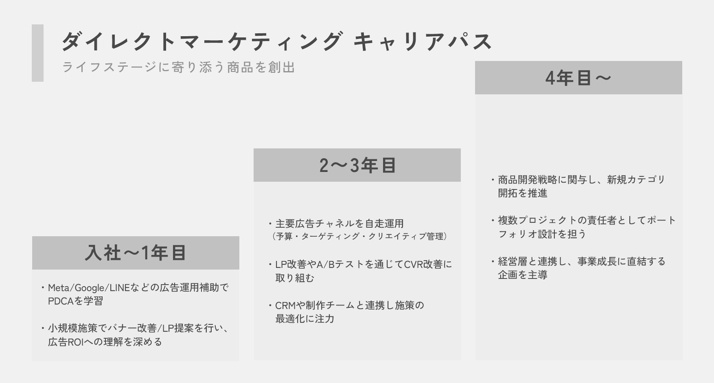 また、広告・CS・商品開発など他部門との連携を通じた部門横断プロジェクトにも参画し、単なる運用にとどまらない、経営視点でのマーケティング戦略を担っていくポジションへと成長していきます。
