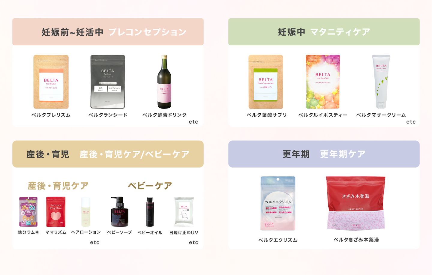 ベルタは、「妊活・妊娠・出産・育児・更年期」といった、女性のライフステージごとに生まれる課題に向き合い、商品とサービスの両面から、幅広くアプローチしています。