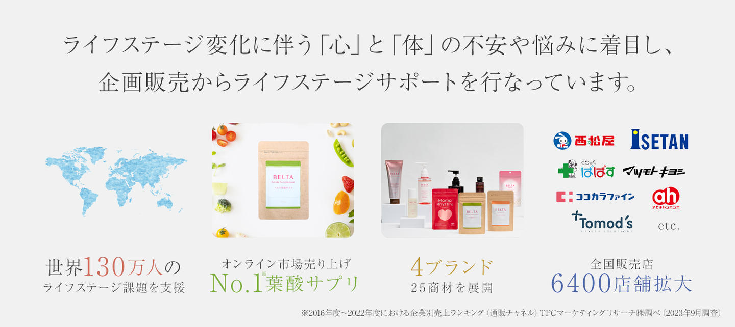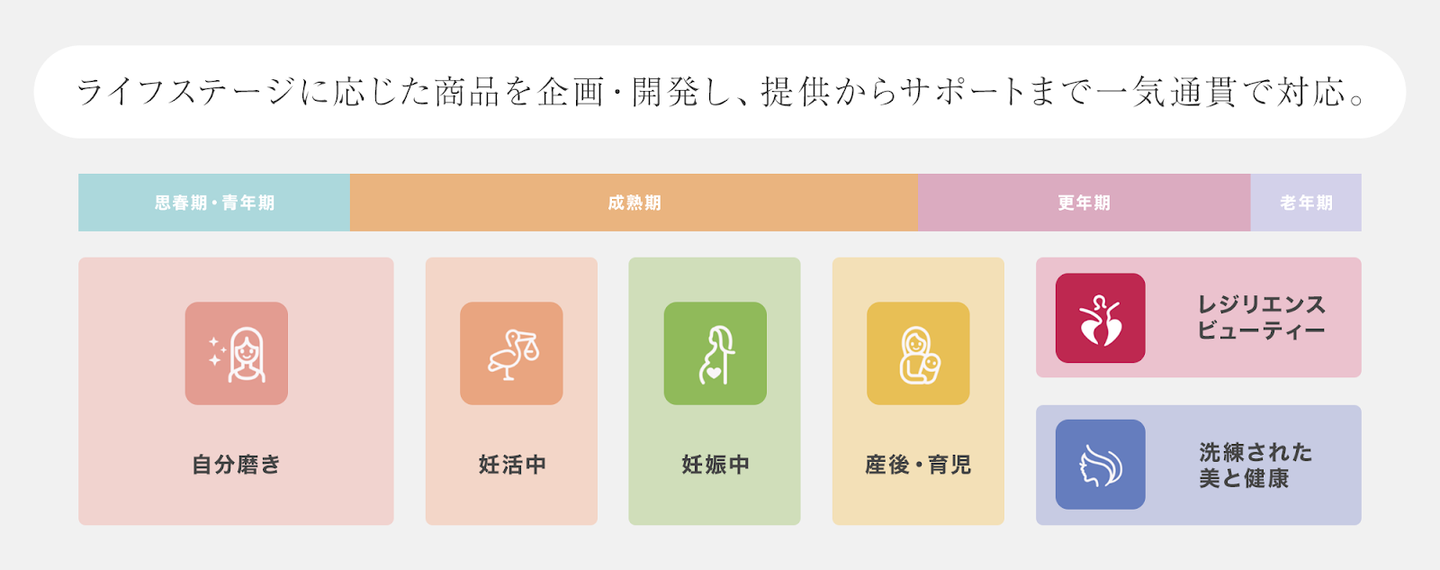 「妊活・妊娠・出産・育児・更年期」といった女性のライフステージごとの課題に向き合い、単に製品を提供するだけでなく、商品・情報・相談サポートを一体的に提供。お客様との長期的な関係を築く『ライフパートナー型ブランド』として、女性の人生をトータルにサポートしています。
