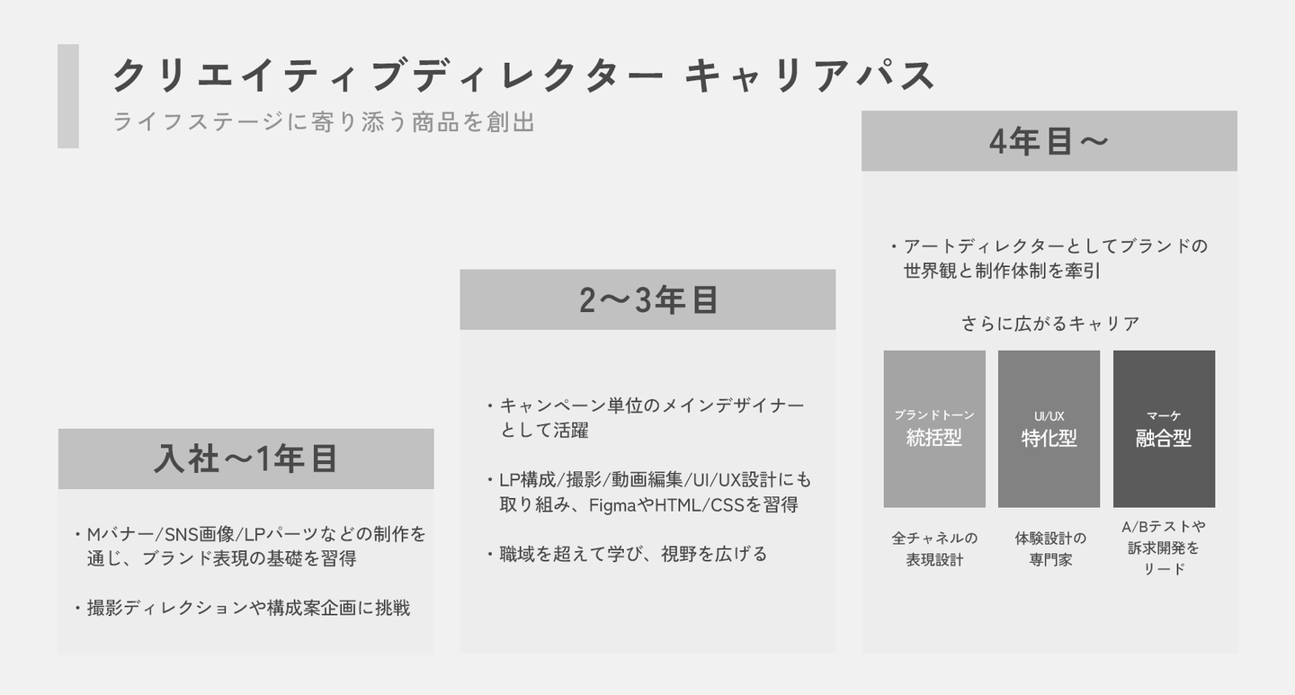 訴求軸の開発や構成案の企画、LP・広告バナー制作、撮影や動画編集ディレクションまで、幅広い表現領域に挑戦。また、Figmaやプロトタイピング、HTML/CSSなどの実装スキルにも触れ、“見た目の美しさ”だけでなく、“伝わる体験”をデザインする視点も育んでいきます。枠にとらわれず、表現の精度を高めながら、自ら学びキャリアを広げていくフェーズです。
