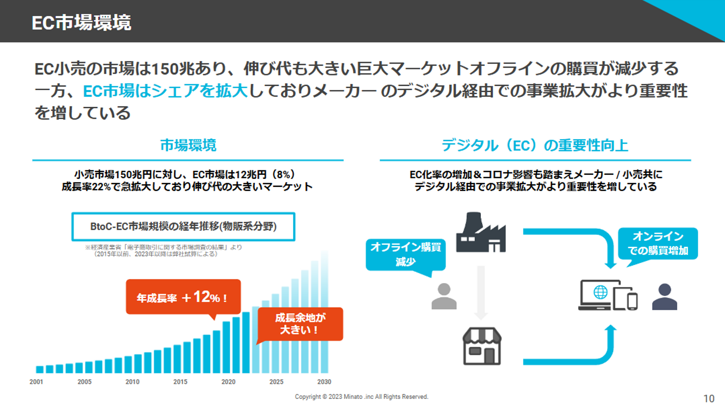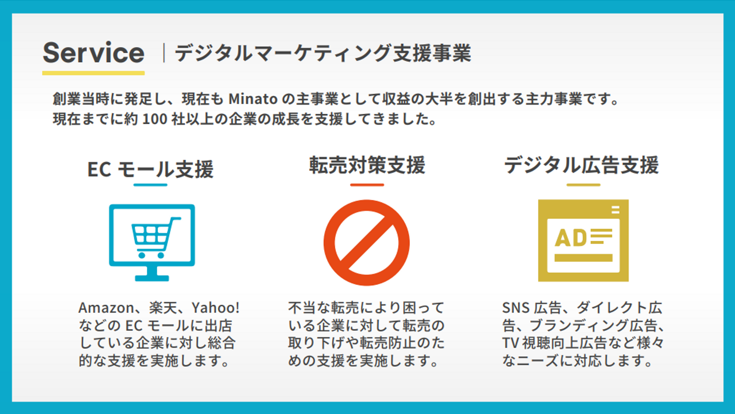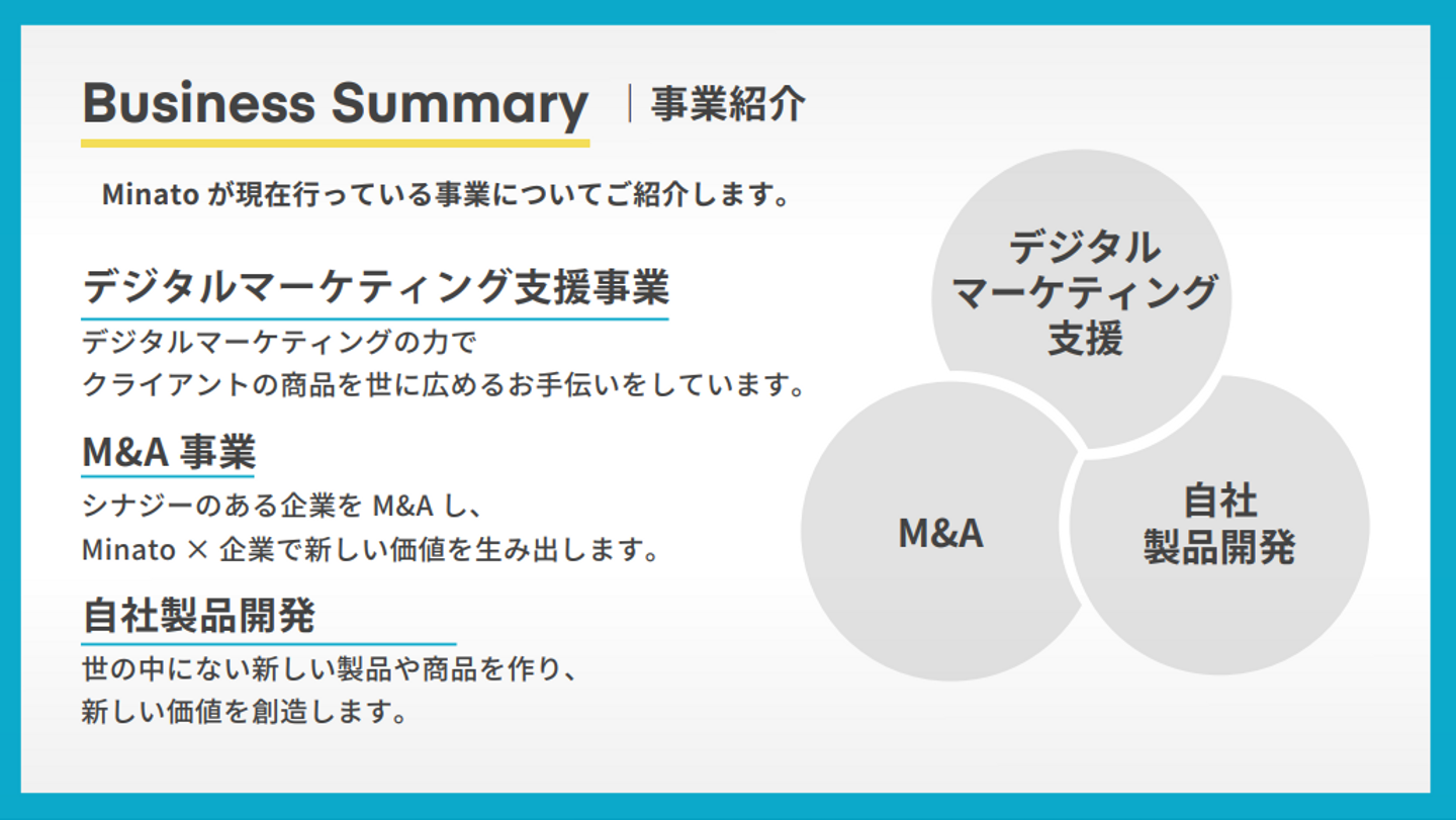 まず、Minatoの事業をご紹介します。Minatoはデジタルマーケティング支援事業を主軸に成長してきましたが、現在はM&Aや自社製品開発にも力を注ぎ、より多角的な事業展開を図っています。