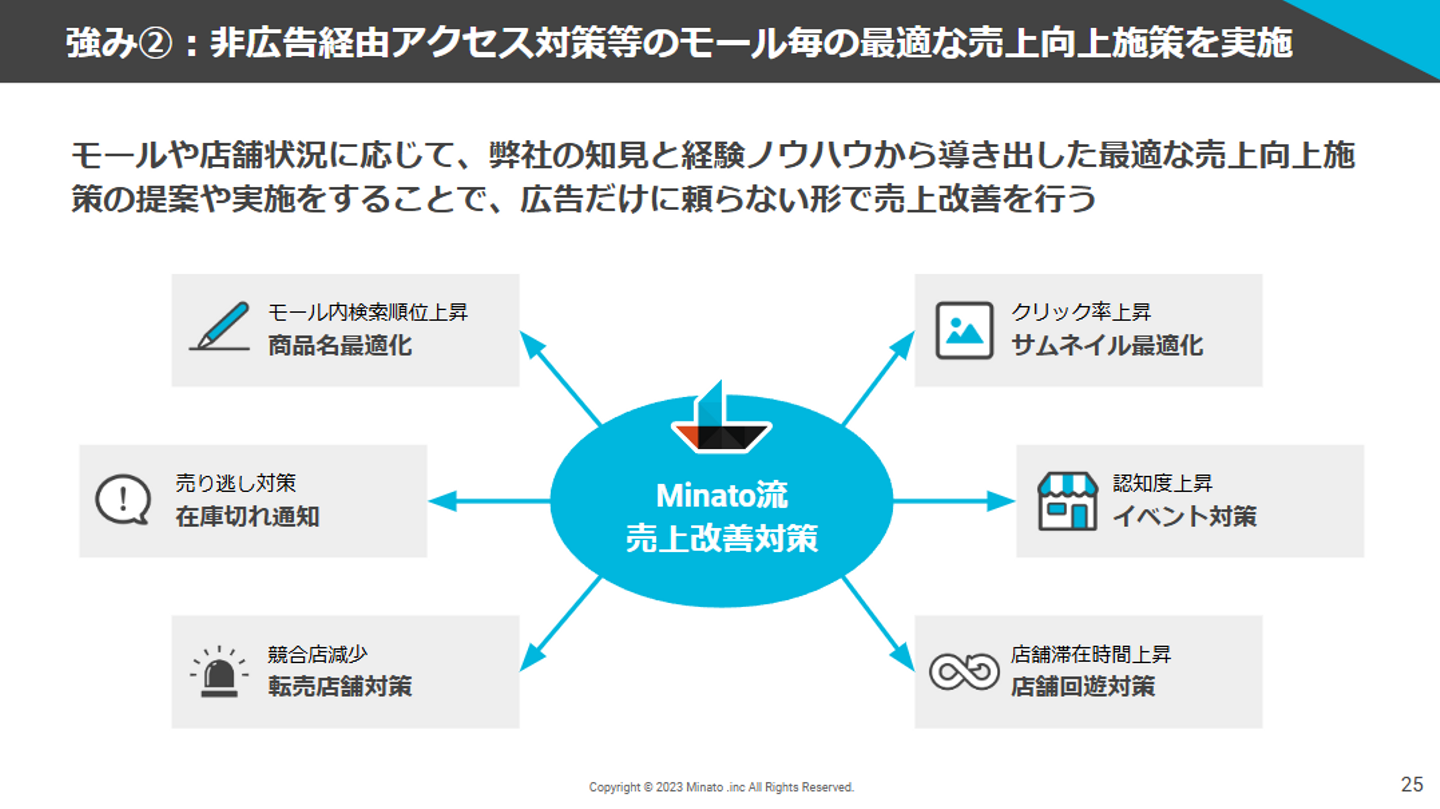 ECモールで売上を伸ばそうとする場合、広告を使うことが一般的ですが、広告費のみに頼ると利益率が低下するリスクがあります。Minatoでは、SEO対策や商品名の最適化、クリック率を向上させるサムネイル最適化、イベント対策、店舗内の回遊対策や転売対策といった包括的な提案を行うことで売上の最大化を図っています。