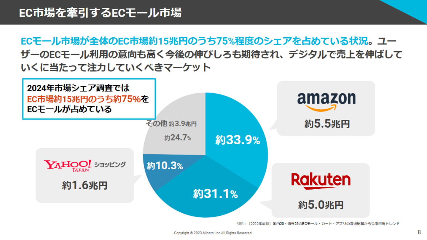 日本のEC市場の特徴は、「自社EC(自社ドメインでの販売)」よりも、楽天市場、Amazon、Yahoo!ショッピング、Qoo10といった「ECモール・プラットフォーム」が主流となっていることです。EC市場の売上の約75%はECモールの売上が占めています。(※3)