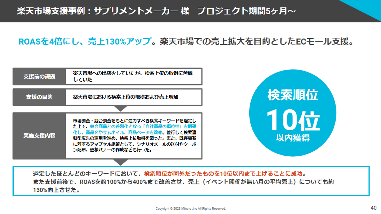 導入事例として、楽天市場のサプリメントメーカーに対する支援をご紹介します。楽天市場に出店後、検索順位の上位が取得できず、売上に伸び悩んでいる状況でした。支援開始後、キーワードの選定や広告運用の最適化を実施し、キーワードの検索順位を圏外から10位以内に上げることができました。その結果、ROAS(広告の費用対効果)が4倍に改善され、売上の約130%向上に貢献しました。